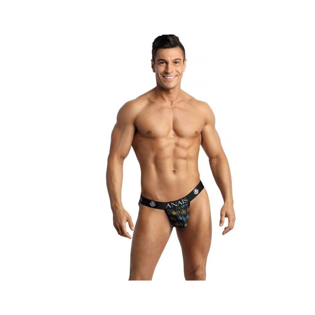 In a sleek black hue, the Rio Jockstrap is decorated with a vibrant pattern of colorful bicycles.