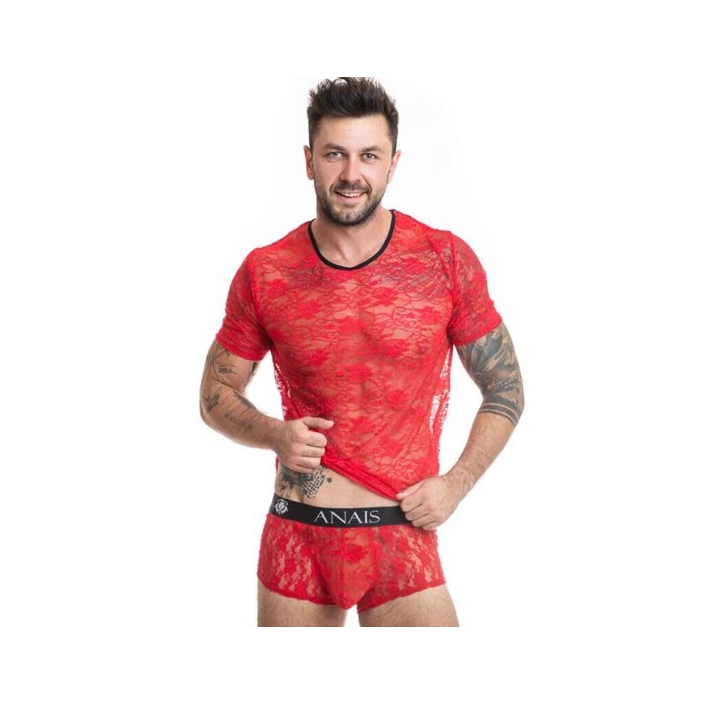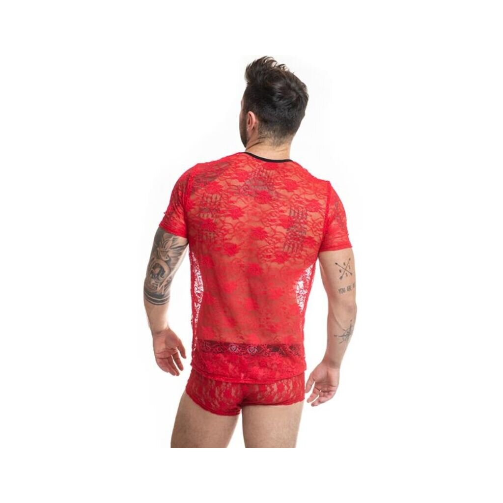 Erleben Sie die Sinnlichkeit und Eleganz des ANAIS Men Brave T-Shirts mit Spitzenmuster in leidenschaftlichem Rot.