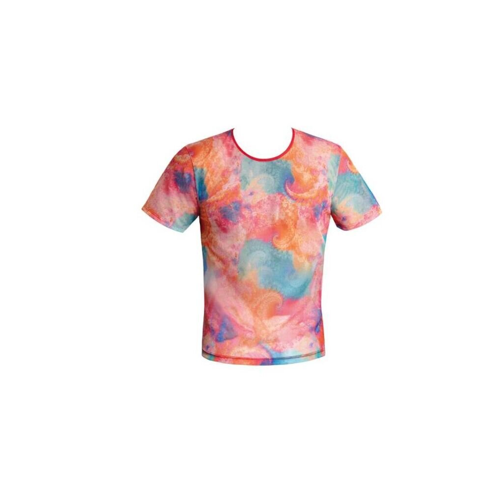 The multicolored design with an eye-catching red trim gives this T-shirt a dynamic and modern aesthetic.