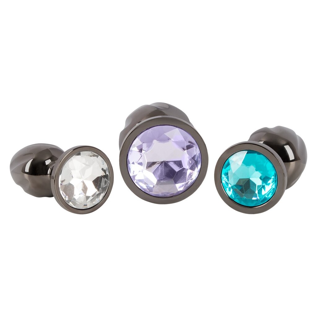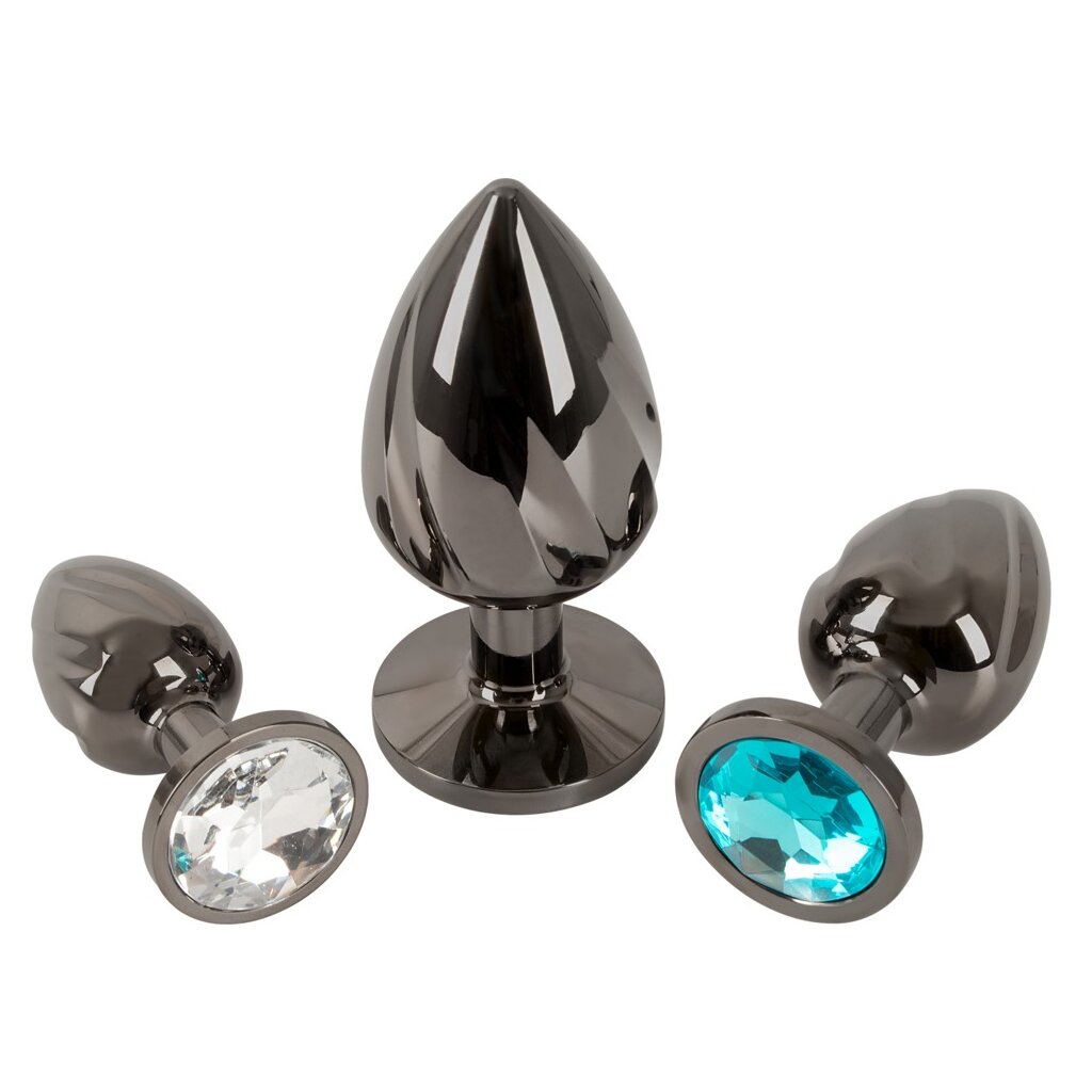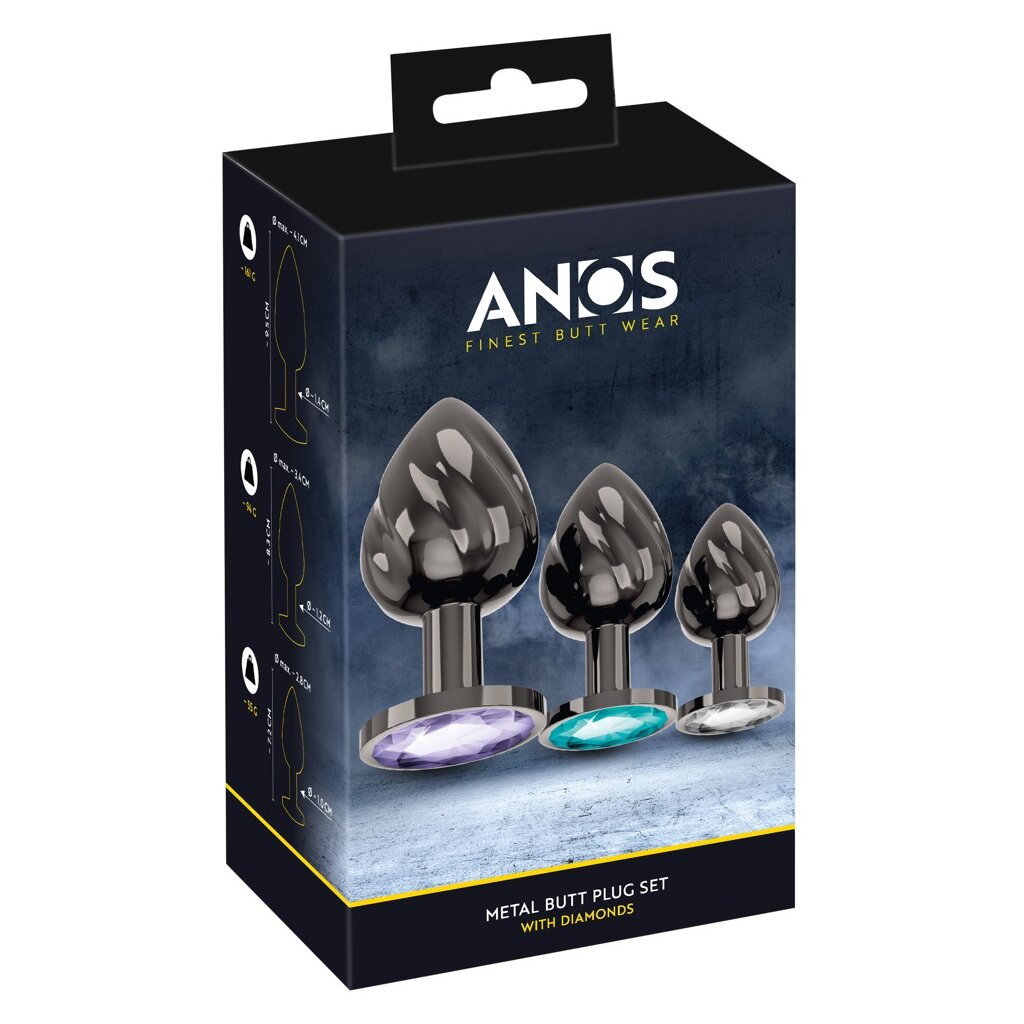 Metal Butt Plug Set with Diamonds von ANOS mit 3 Metall-Plugs in verschiedenen Größen und Gewichten. Für anale Stimulation und perfektes Dehn-Training. Dabei schmückt jeder Plug mit einem anders farbigen Schmuckstein am analsicheren Stopper glitzernd den Anus. Die rundum spiralgeriffelten Plugs aus Metall können für Temperaturspiele auch erwärmt oder abkühlt werden.