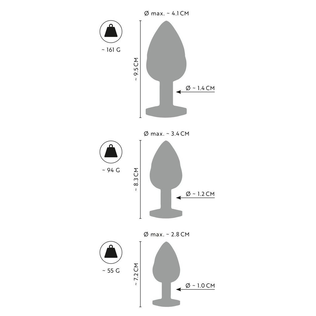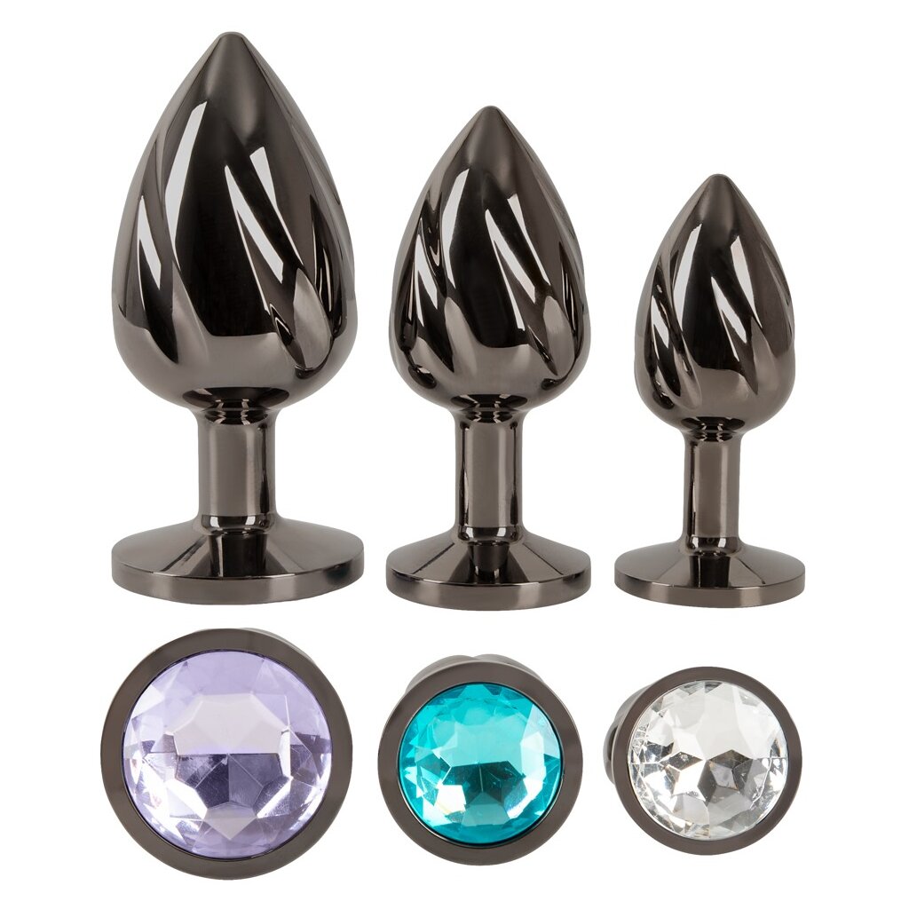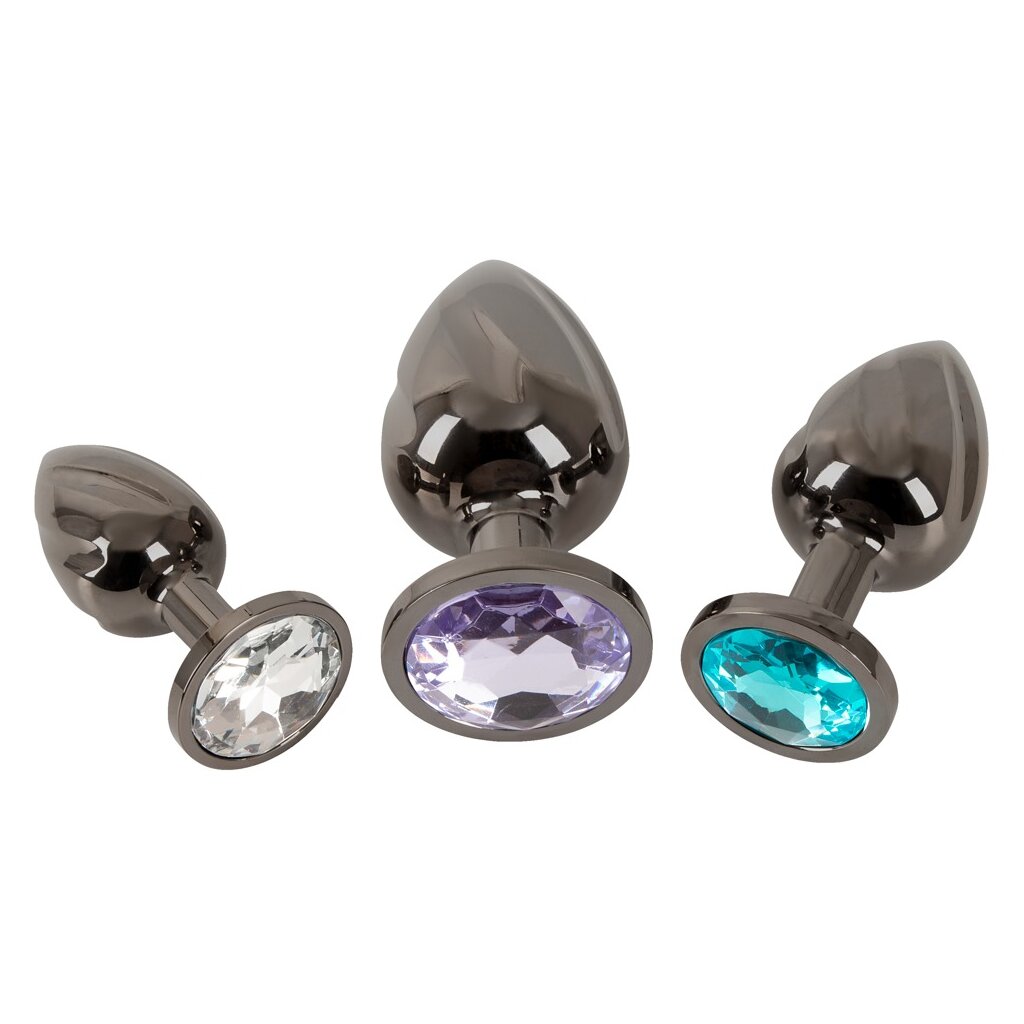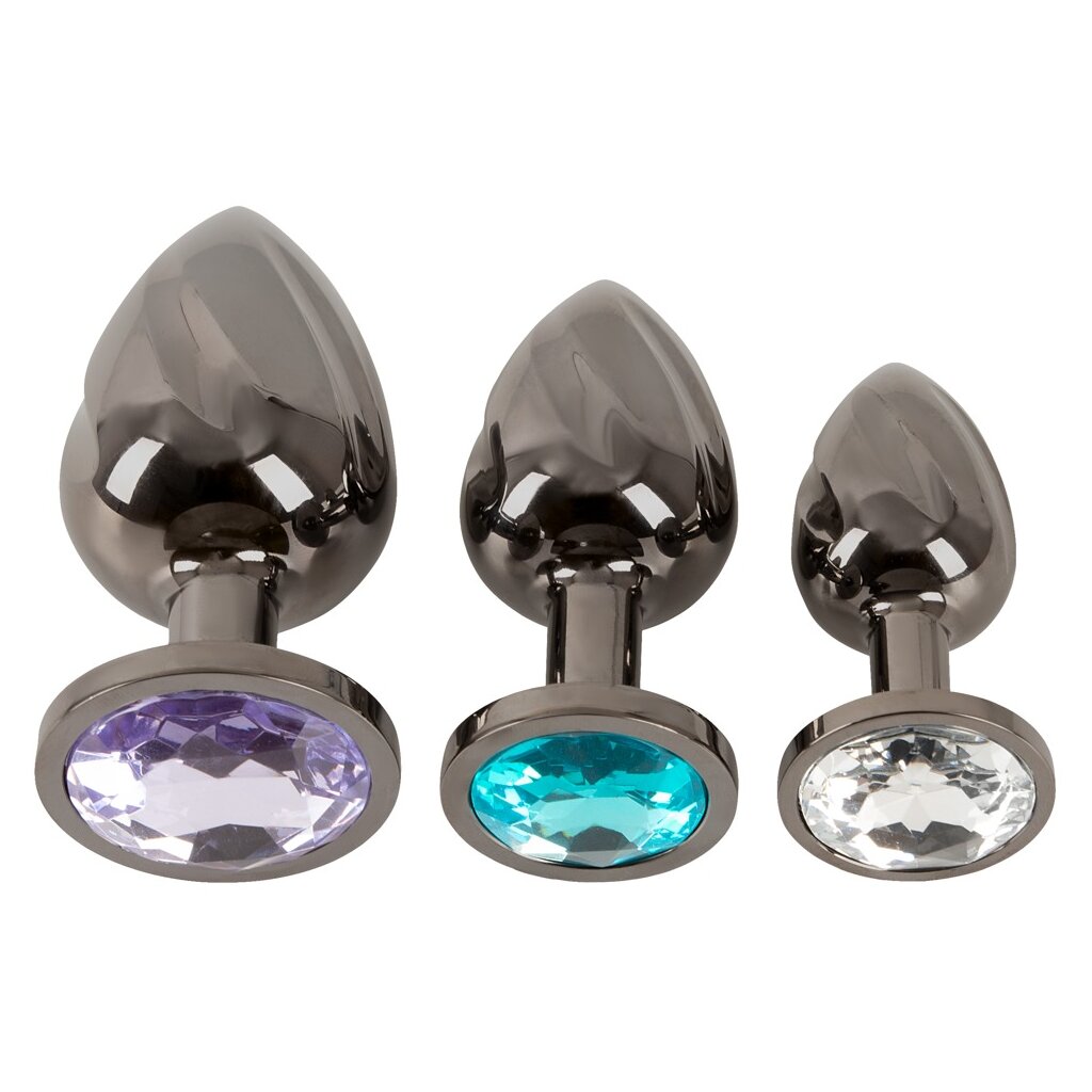Metal Butt Plug Set with Diamonds von ANOS mit 3 Metall-Plugs in verschiedenen Größen und Gewichten. Für anale Stimulation und perfektes Dehn-Training. Dabei schmückt jeder Plug mit einem anders farbigen Schmuckstein am analsicheren Stopper glitzernd den Anus. Die rundum spiralgeriffelten Plugs aus Metall können für Temperaturspiele auch erwärmt oder abkühlt werden.