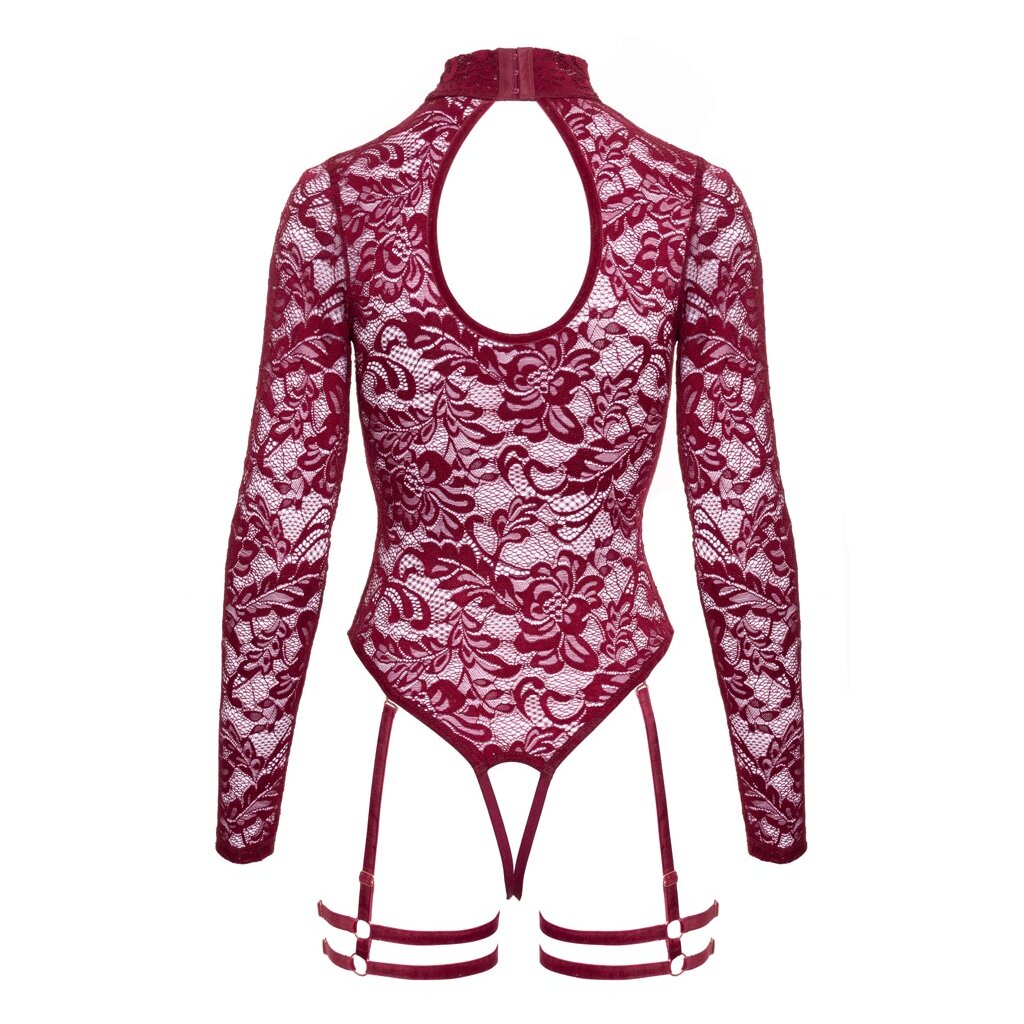 Burgundy red long-sleeved bodysuit by Abierta Fina with garter belt. Made from soft, stretchy floral lace, seductively accented with velvet details and rose gold decorative chains. Soft and elastic all around for high wearing comfort. In a provocative open design with cutouts for the breasts and an inviting open crotch. The lace bodysuit also seduces with a beautiful round neckline at the back. The heart-shaped decorative chain at the front of the stand-up collar (with hook closure) is removable, as is the carabiner chain on the rings under the breasts. The adjustable garter straps and thigh straps are also removable from the lace bodysuit.