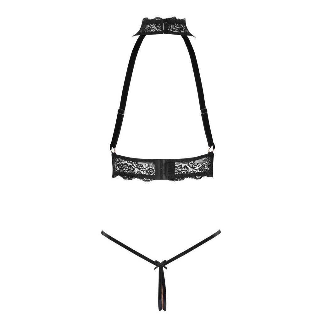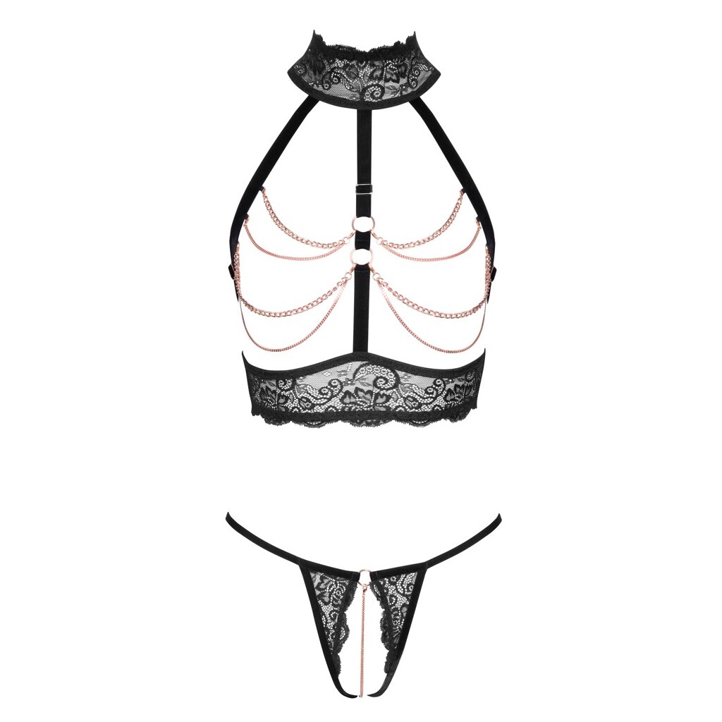 Aufregendes Set von Abierta Fina mit busenfreiem Oberteil und schrittoffenem Tanga. Weiche schwarze, elastische Spitze, Samtträger und roségoldfarbene Ketten setzen sich verführerisch in Szene! Top mit passenden, verstellbaren Samtträgern und Strapsen. Der Hakenverschluss auf der Rückseite kann ebenfalls verstellt werden. Der Spitzen-Halfterneck wird mit 2 Knöpfen hinten im Nacken geschlossen. Der String verführt mit einer anregenden Kette im offenen Schritt, die auch abgenommen werden kann.