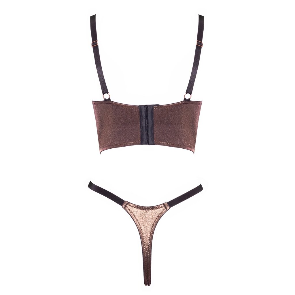 Luxuriöses Ouvert-Set von Abierta Fina mit Push-up-BH und Rio-String in stilvollem, schimmerndem Bronzegold mit schwarzen Details und eleganten roségoldfarbenen Schmukelementen. Rundum elastisch, weich und geschmeidig. Länger geschnittener Push-up-BH mit geformten Bügeln vorne und leicht gepolsterten Bügel-Cups für eine perfekte Passform ohne Bügel. Kleiner herzförmiger Schmuckanhänger zwischen den Cups. Wunderschönes Schmuckdetail an jedem der verstellbaren Träger vorne. Verstellbarer Hakenverschluss hinten. Der Rio-String verführt mit offenem Schritt und Schmuckdetails vorne am elastischen Bund.