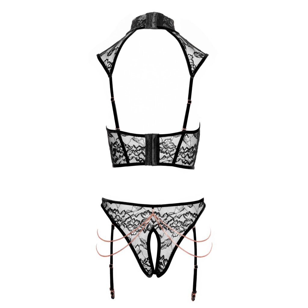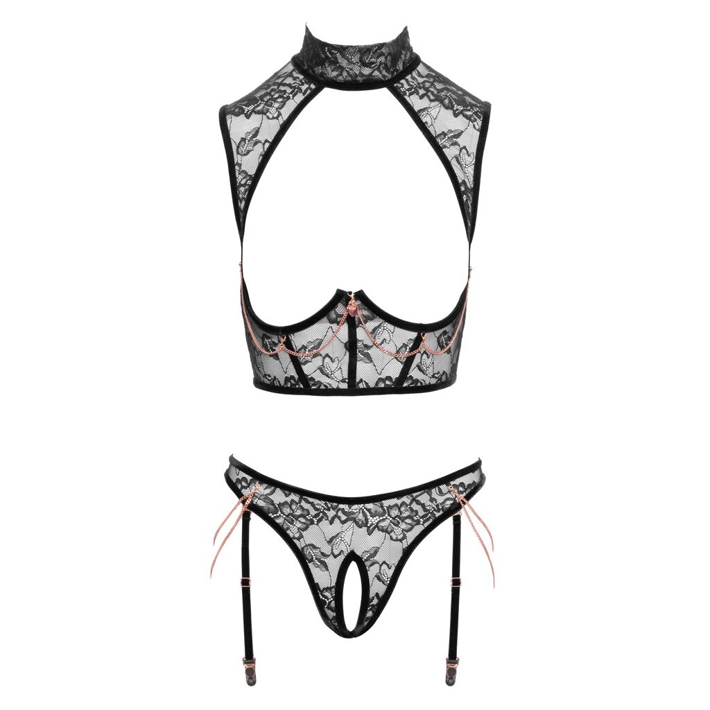 Aufregendes Set von Abierta Fina mit Bustier-Oberteil und Strumpfhalter-Slip. Feine schwarze Blumenspitze, verführerisch abgesetzt mit Samtdetails und roségoldenen Ketten. Rundum weich und elastisch für hohen Tragekomfort.