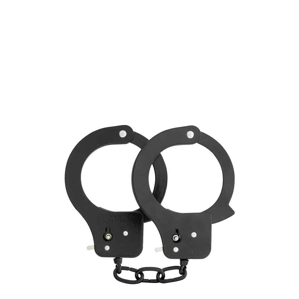 A pair of metal hand cuffs that are easy to apply and open again. They are connected to each other with a short, strong chain and supplied with two keys. The cuffs are perfect for bondage beginners. Use them to bind your lover to the bed or furniture, to tie the wrists together, or to create other BDSM positions that come to mind.