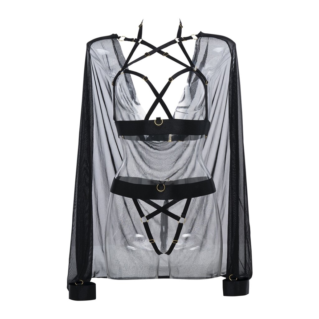 The things you show and the things you hide. Irresistibly charming with flirtatious attitude, the Sweet Little Lies set is effortlessly seductive. The detachable mesh cape with wrist cuffs decorates the ultra-strappy harness top.
