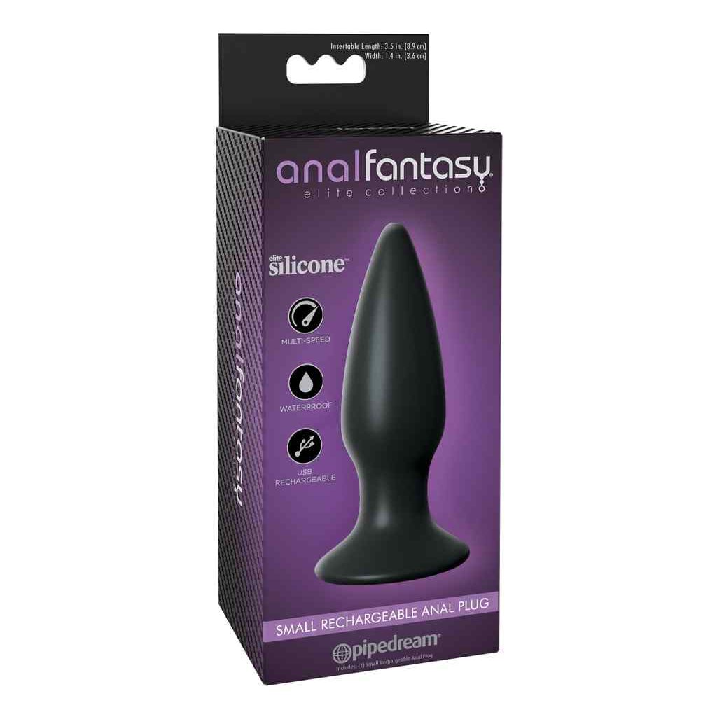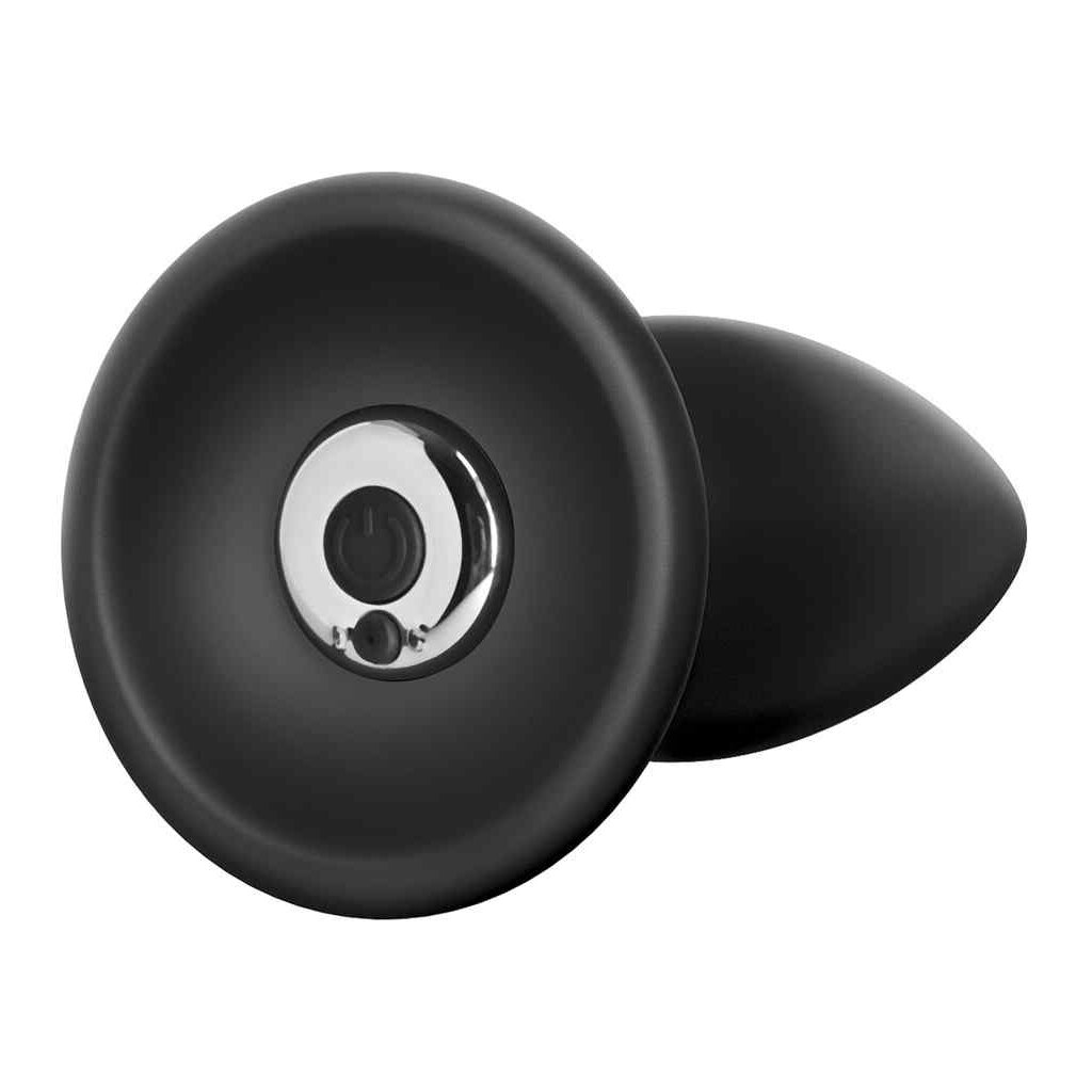Black butt plug with 7 vibration levels at the push of a button. It has a round base and is waterproof. Includes a USB cable.