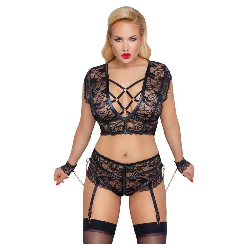 BH und Straps-Slip ouvert von Cottelli BONDAGE aus weicher elastischer Spitze mit Mattlook-Streifen und roségoldfarbenen Elementen. Für fesselnde Lustmomente sorgen die Spitzen-Handfesseln, die mit Karabinerketten an den seitlichen Ringen des Slips befestigt werden können. Der Soft-BH ist etwas länger geschnitten und im tiefen Ausschnitt vorne mit einem Riemenkreuz aus Stretchbändern versehen. Im Nacken hat der BH einen Clip-, im Rücken einen Hakenverschluss. Der Slip ist im Schritt einladend offen. Die verstellbaren Strapse sind vom Slip abnehmbar.
