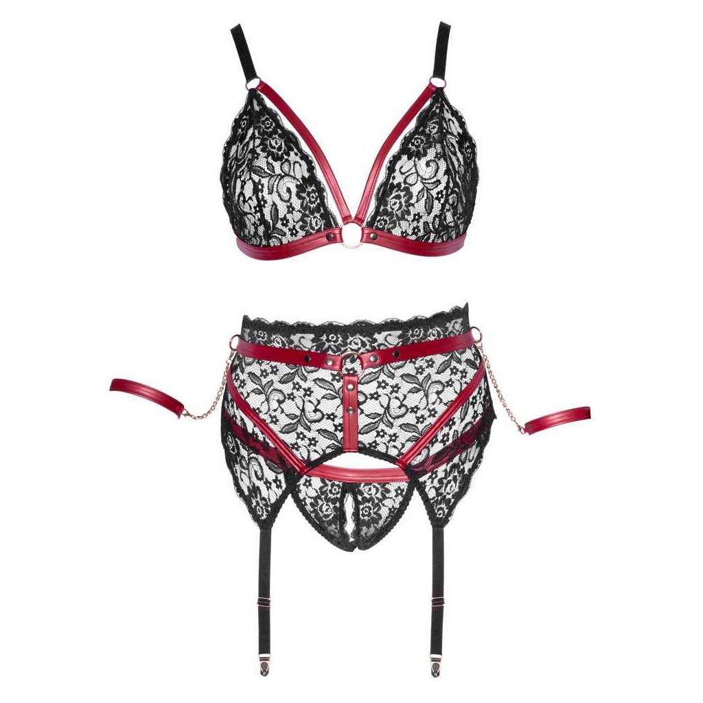 Soutien-gorge, porte-jarretelles et culotte ouverte de Cottelli BONDAGE en dentelle noire élastique avec des détails sophistiqués en aspect mat rouge foncé ainsi que des éléments de couleur or rose et des clous cool. Soutien-gorge avec des bretelles légèrement plus larges et réglables, fermeture par crochet dans le dos. Le porte-jarretelles peut être accroché à des anneaux situés sur le côté des brassards fermés avec leurs chaînes à mousquetons. Le porte-jarretelles a une fermeture à crochet dans le dos et des bretelles réglables. La culotte sans entrejambe qui va jusqu'au fond complète ce trio excitant.