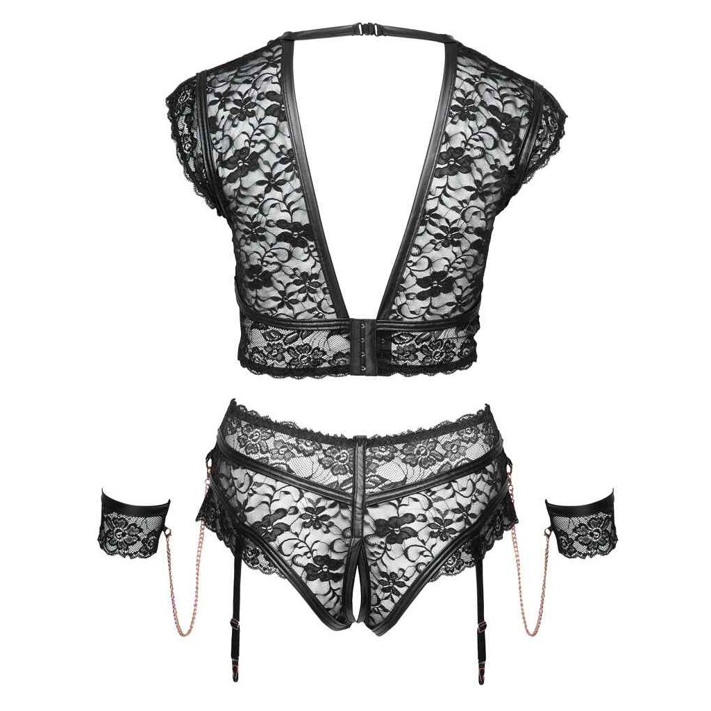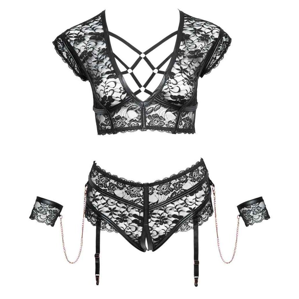 Bra and suspender panties ouvert by Cottelli BONDAGE made of soft elastic lace with matt look stripes and rose gold-colored elements. For captivating moments of pleasure, the lace handcuffs that can be attached to the side rings of the panties with carabiner chains. The soft bra is cut slightly longer and has a strap cross made of stretch bands in the deep neckline at the front. In the neck the bra has a clip closure, in the back a hook closure. The briefs are invitingly open at the crotch. The adjustable suspenders are removable from the briefs.