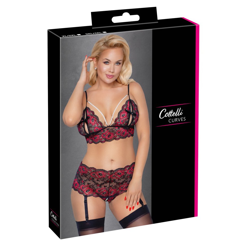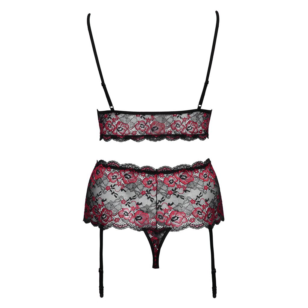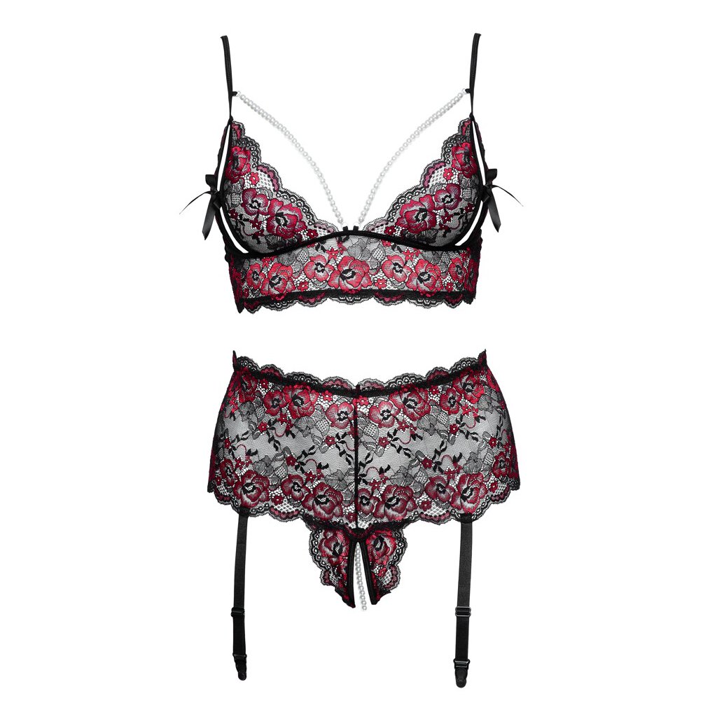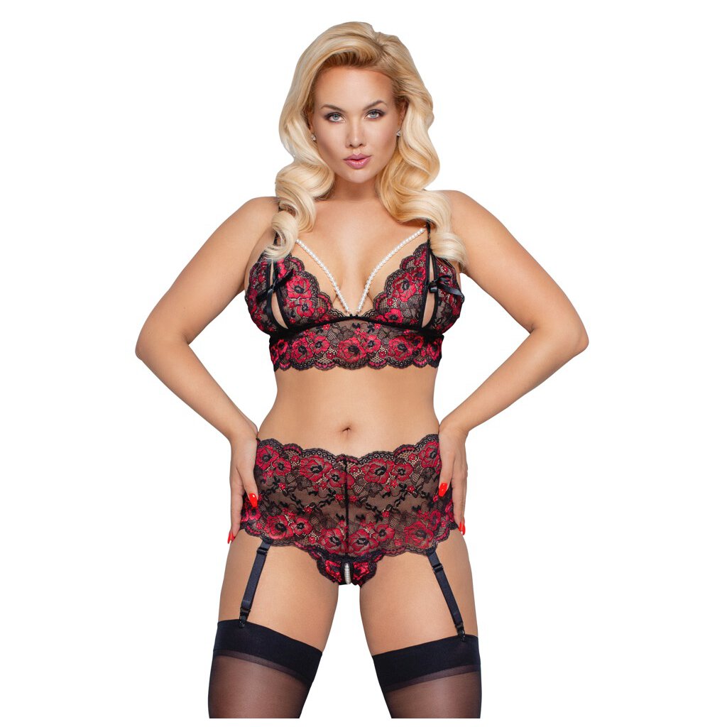 Soutien-gorge sans fil et slip sans entrejambe, à jarretelles, entièrement en dentelle florale douce et extensible de deux couleurs différentes. Le soutien-gorge se distingue par ses chaînes de perles dans la zone du décolleté et les fentes dans les bonnets. Chaque bonnet est maintenu par un petit nœud. Les bretelles extensibles sont réglables. Le slip taille haute est orné d'une chaîne en perles au-dessus de la zone d'entrejambe ouverte. Les bretelles peuvent être ajustées et retirées.