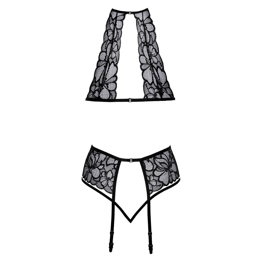 Soft bra, suspender belt & thong in a set by kissable completely made of fine floral lace. All around soft and elastic for highest wearing comfort. Stylish bra with hook closure at neck and back. Suspender belt with hook closure in the back, the suspenders are adjustable to fit. The small thong seduces with its two narrow stretch straps that join at the crotch.