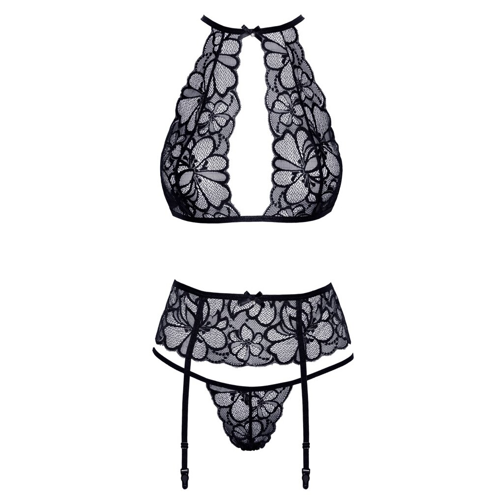 Soft bra, suspender belt & thong in a set by kissable completely made of fine floral lace. All around soft and elastic for highest wearing comfort. Stylish bra with hook closure at neck and back. Suspender belt with hook closure in the back, the suspenders are adjustable to fit. The small thong seduces with its two narrow stretch straps that join at the crotch.