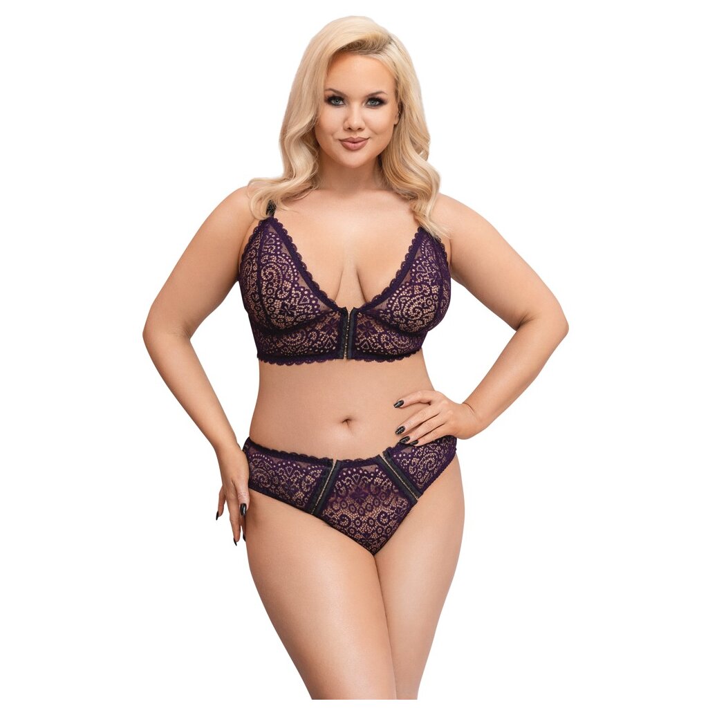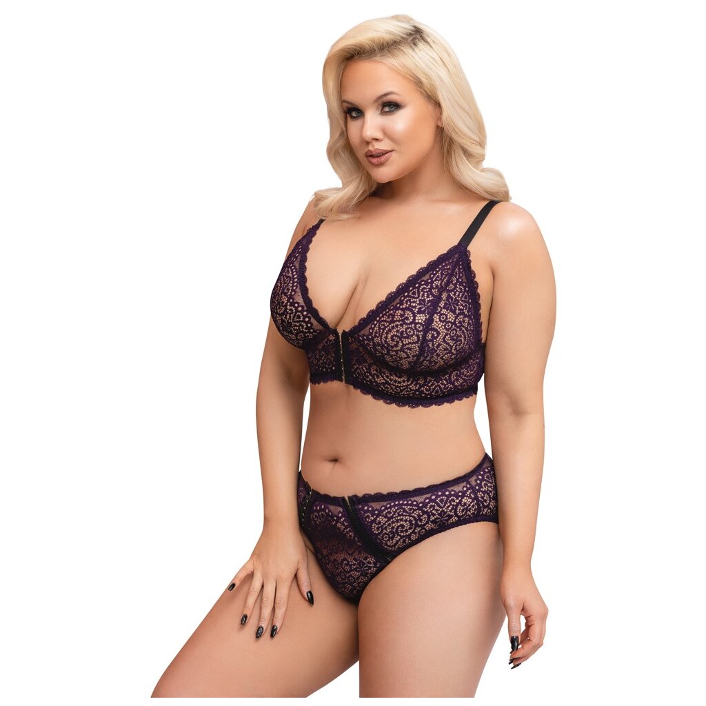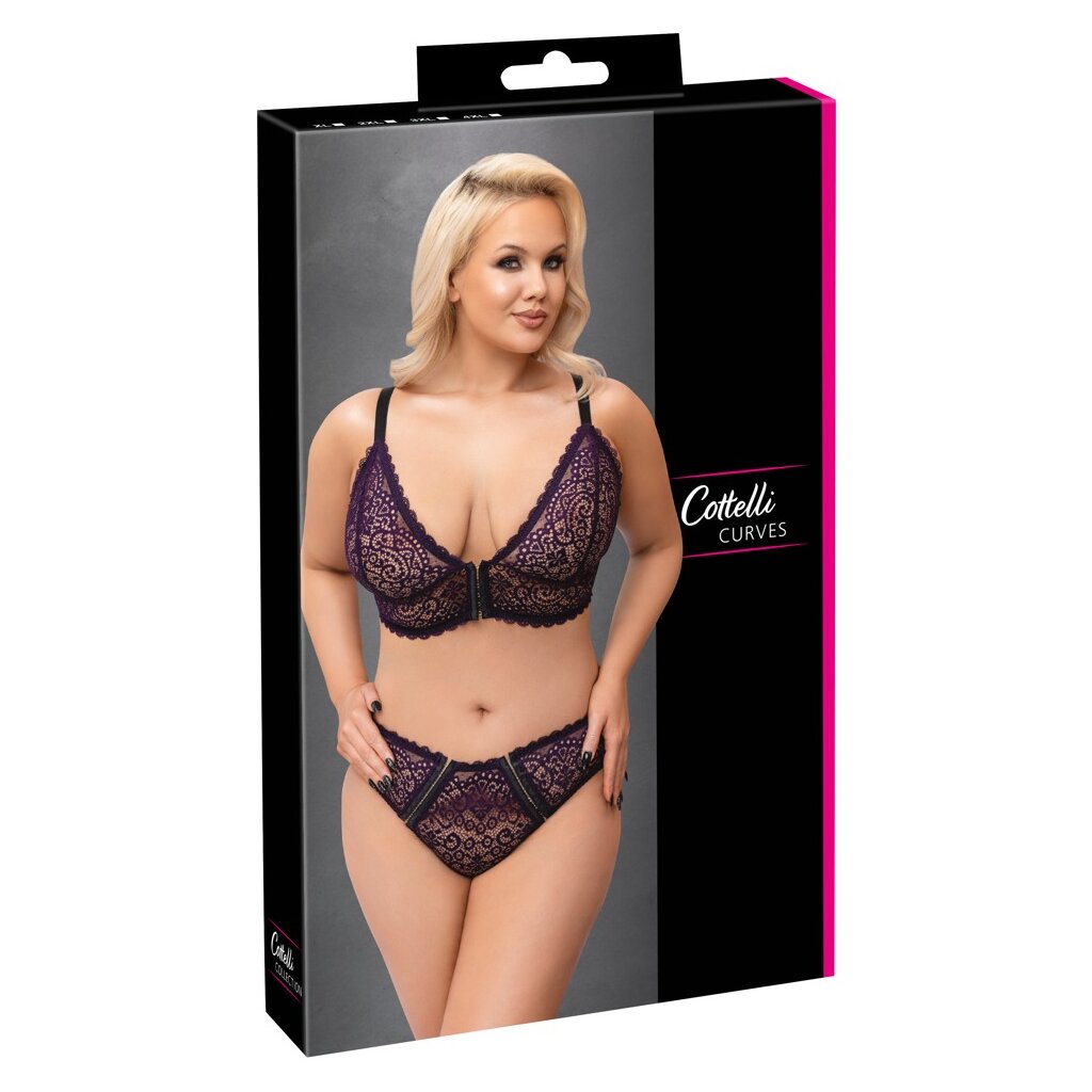Bralette and briefs in a set by Cottelli CURVES completely made of fine purple lace. All around soft and elastic for highest wearing comfort. Bralette with full-length hook closure between the cups. The straps are adjustable to fit. And the briefs present themselves immediately with 2 hook closure strips in the front part, which can also be opened completely.