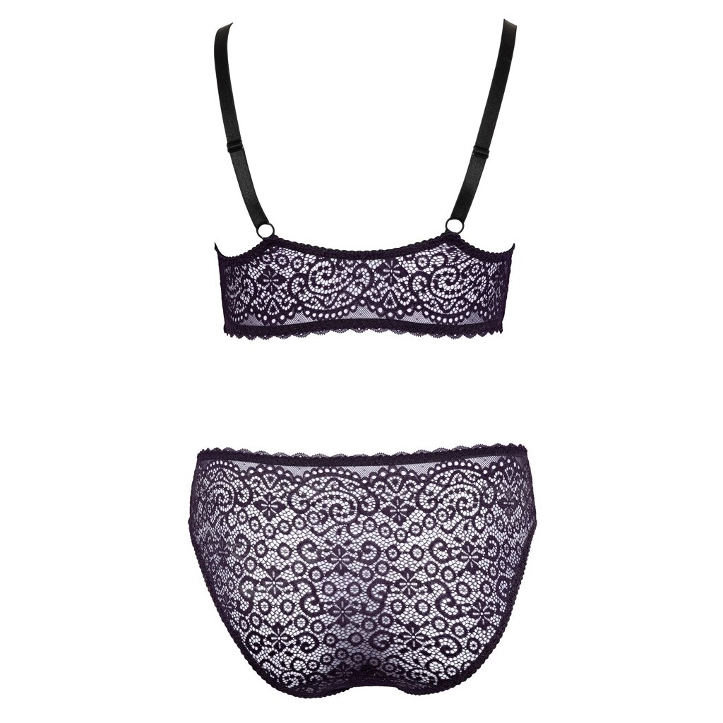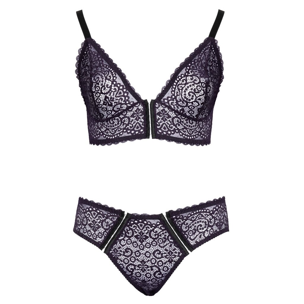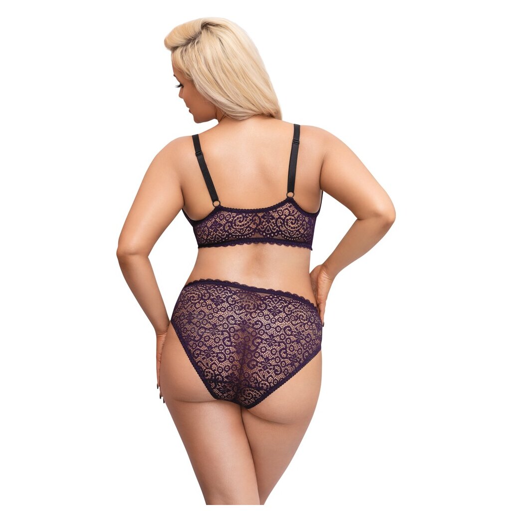 Bralette and briefs in a set by Cottelli CURVES completely made of fine purple lace. All around soft and elastic for highest wearing comfort. Bralette with full-length hook closure between the cups. The straps are adjustable to fit. And the briefs present themselves immediately with 2 hook closure strips in the front part, which can also be opened completely.