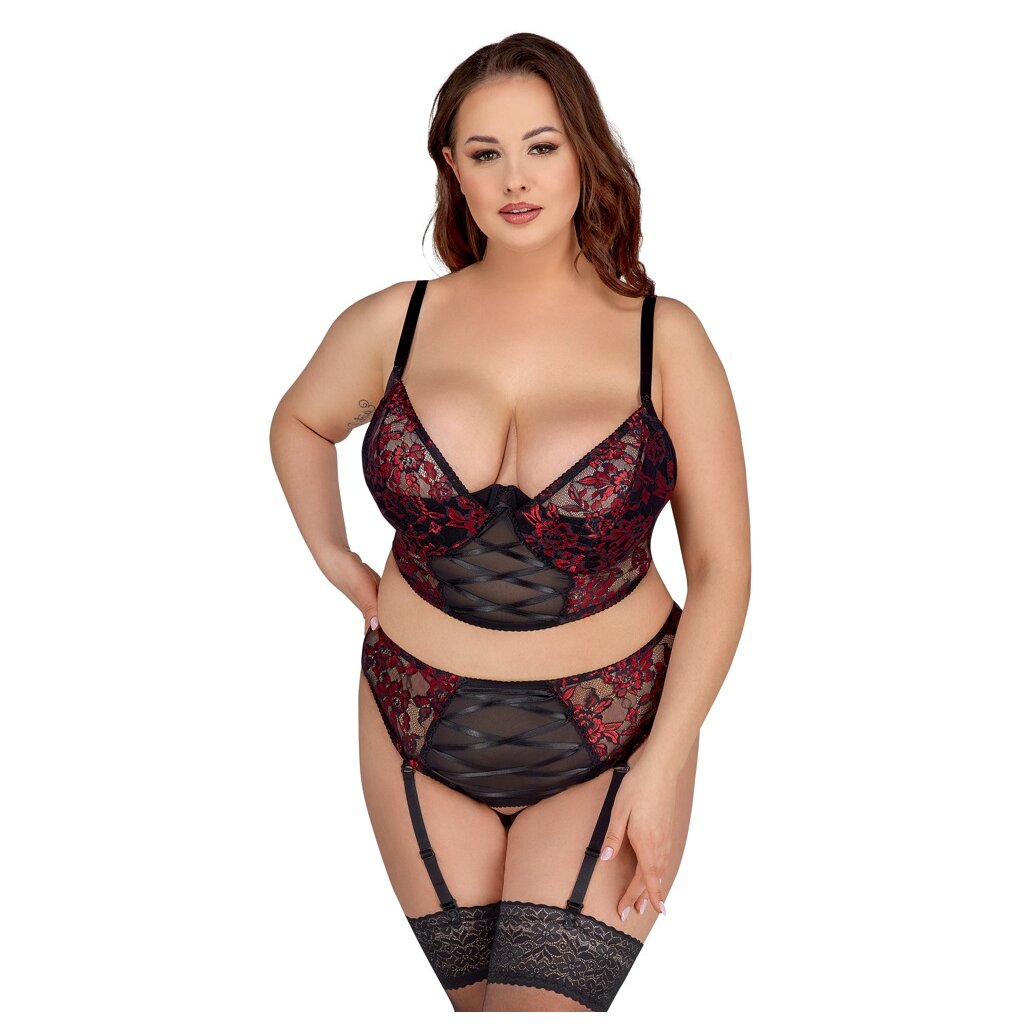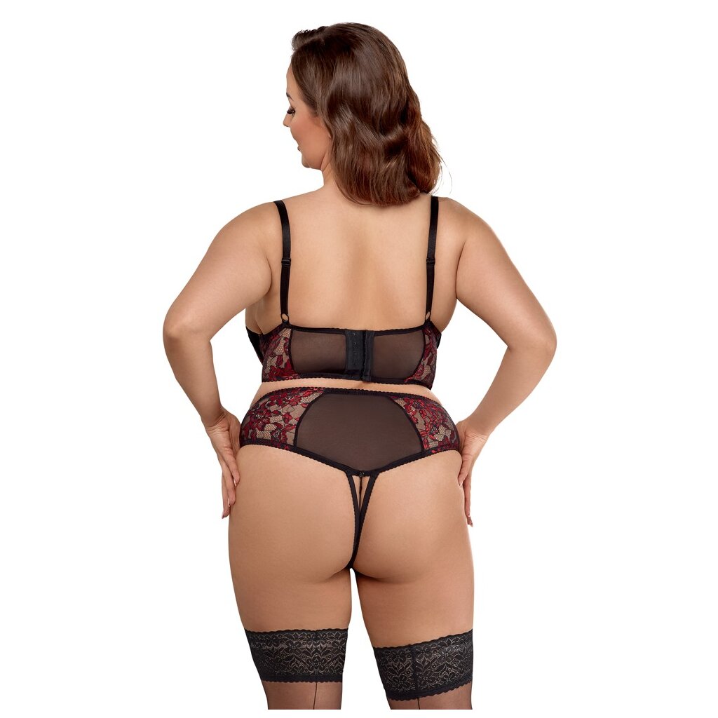 Longline-BH und Straps-Höschen im Set von Cottelli CURVES in einem feinen Materialmix aus 2-farbiger weicher Stretch-Blumenspitze und feinem elastischen Powernet. Beide Vorderseiten sind zusätzlich mit einer Satin-Zierschnürung versehen. Der Longline-BH überrascht mit seinen abknöpfbaren Spitzencups, unter denen sich ein gefütterter Bügellift verbirgt. Die Träger und der Hakenverschluss im Rücken sind in der Passform verstellbar. Das hüfthoch geschnittene Straps-Höschen verführt mit einem abknöpfbaren Schritt, so dass das Höschen auch im Schritt getragen werden kann. Die beiden Strapshalter vorne sind verstellbar und ebenfalls komplett abnehmbar.