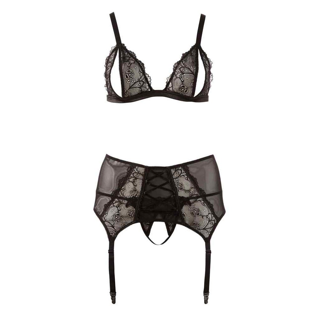 Soft bra with open cups, adjustable straps and hook closure in the back. Suspender belt with decorative lacing and four adjustable straps. Matching string enclosed. 90% polyamide, 10% spandex. Without stockings.