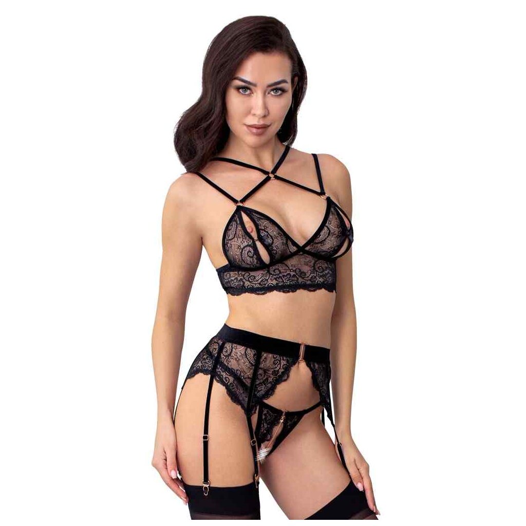 Soutien-gorge, porte-jarretelles et string sans entrejambe de la marque Abierta Fina en dentelle noire extensible avec des détails en velours et des accessoires couleur or rose. Le soutien-gorge est plus long que les soutiens-gorge normaux et possède des bonnets fendus avec de petites fermetures à crochets sous les nœuds en satin. Il y a également une fermeture à crochets dans le dos. Les doubles bretelles réglables en velours s'entrecroisent au niveau du décolleté et se transforment en quatre bretelles à l'arrière. Le porte-jarretelles a une ceinture en velours et un anneau décoratif à l'avant. Le porte-jarretelles a également une fermeture à crochets à l'arrière. Les 6 bretelles peuvent être ajustées. Le string assorti est complètement sans entrejambe et possède une chaîne amovible au-dessus de l'entrejambe.