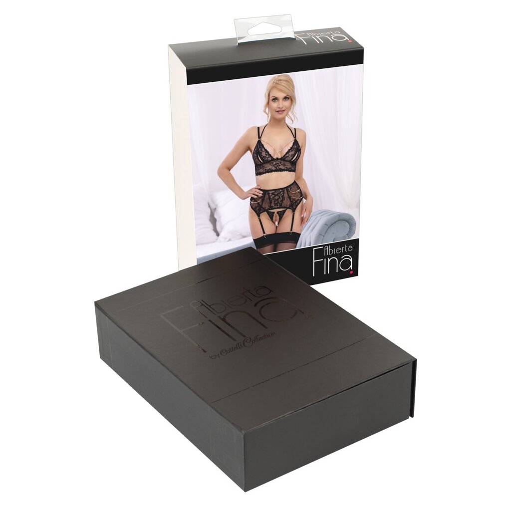 Bralette, suspender belt and slip ouvert united in the set by Abierta Fina. Everything is made of fine elastic lace and adorned with rose gold-colored elements, as well as chains decorated with rhinestones. The bralette with its slit cups allows sensual access. The completely crotchless panties seduce with a stimulating little chain. And the airy suspender belt in lace-up look rounds off the revealing ensemble in an elegantly erotic way. The straps, halter neck and garter belt are adjustable for an optimal fit. The chains are all removable.