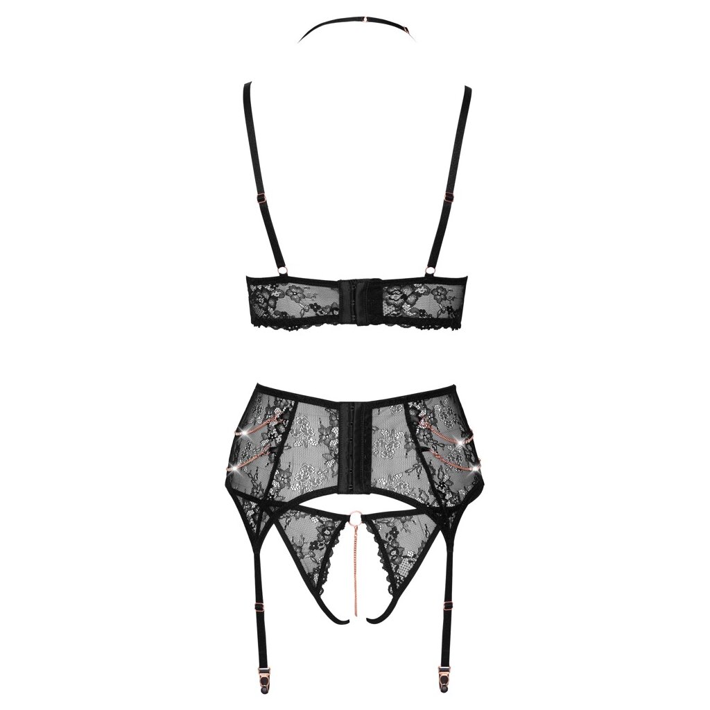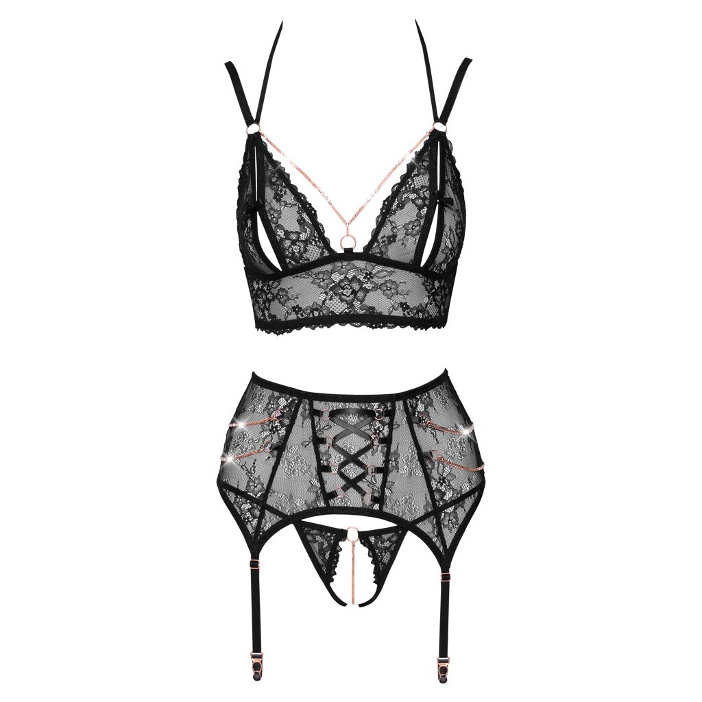Bralette, suspender belt and slip ouvert united in the set by Abierta Fina. Everything is made of fine elastic lace and adorned with rose gold-colored elements, as well as chains decorated with rhinestones. The bralette with its slit cups allows sensual access. The completely crotchless panties seduce with a stimulating little chain. And the airy suspender belt in lace-up look rounds off the revealing ensemble in an elegantly erotic way. The straps, halter neck and garter belt are adjustable for an optimal fit. The chains are all removable.