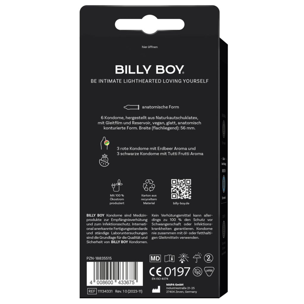 6 Kondome hergestellt aus Naturkautschuklatex mit Gleitfilm und Reservoir, vegan, glatt, anatomisch konturierte Form: 3 rote Kondome mit Erdbeer Aroma, 3 schwarze Kondome mit Tutti-Frutti Aroma