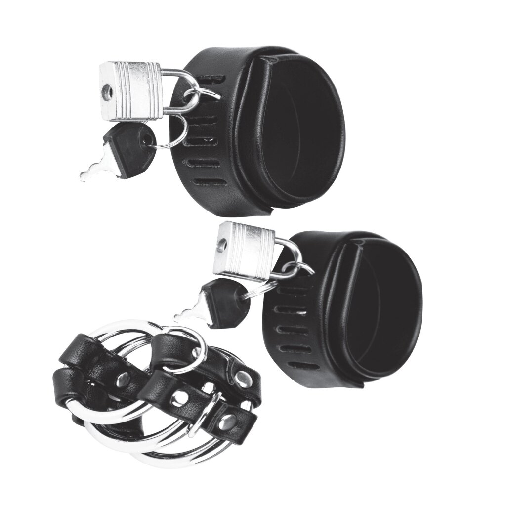 Use this chastity set to punish the penis. It's time to lock him up. Lockable ball stretcher & cock cage. Made from PU and metal.