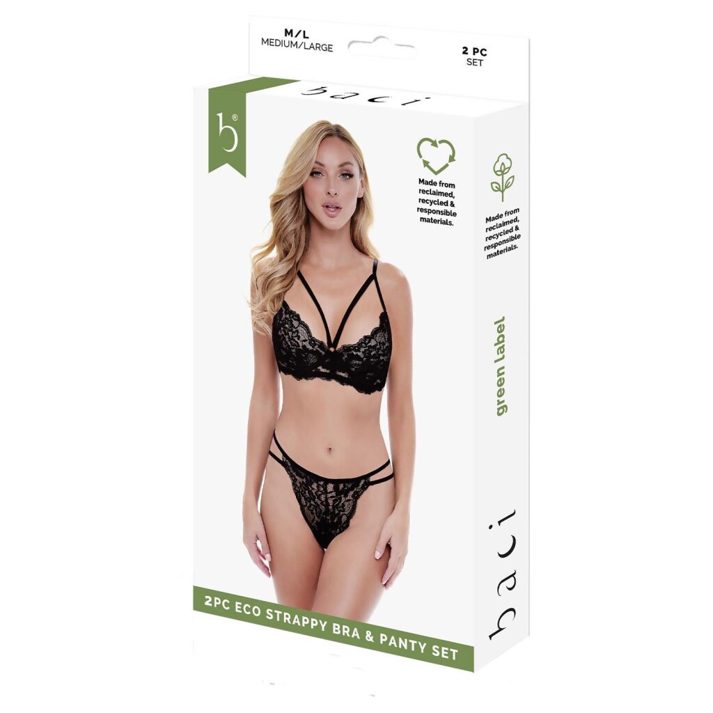 Dieses verführerische zweiteilige Set von Baci verbindet nachhaltige Eleganz mit sinnlichem Design. Der zarte BH zeigt verspielte Riemchen, die Deine Kurven kunstvoll umrahmen und Deinen Körper auf aufregend erotische Weise akzentuieren. Dazu schmiegt sich der passende Slip an Deine Hüften und betont Deine Silhouette mit einer Mischung aus Transparenz und zarter Spitze, die Dich weich umhüllt.
