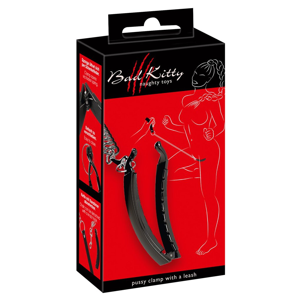 Le Pussy Clamp avec laisse de Bad Kitty combine une pince à lèvres sophistiquée avec une laisse en chaîne. La pince incurvée, idéale du point de vue anatomique, s'ouvre à l'aide d'un ressort de jambe et se referme simplement après avoir été mise en place autour des lèvres. La longue laisse en chaîne munie d'une dragonne en similicuir peut être détachée de l'anneau de la pince grâce au mousqueton.