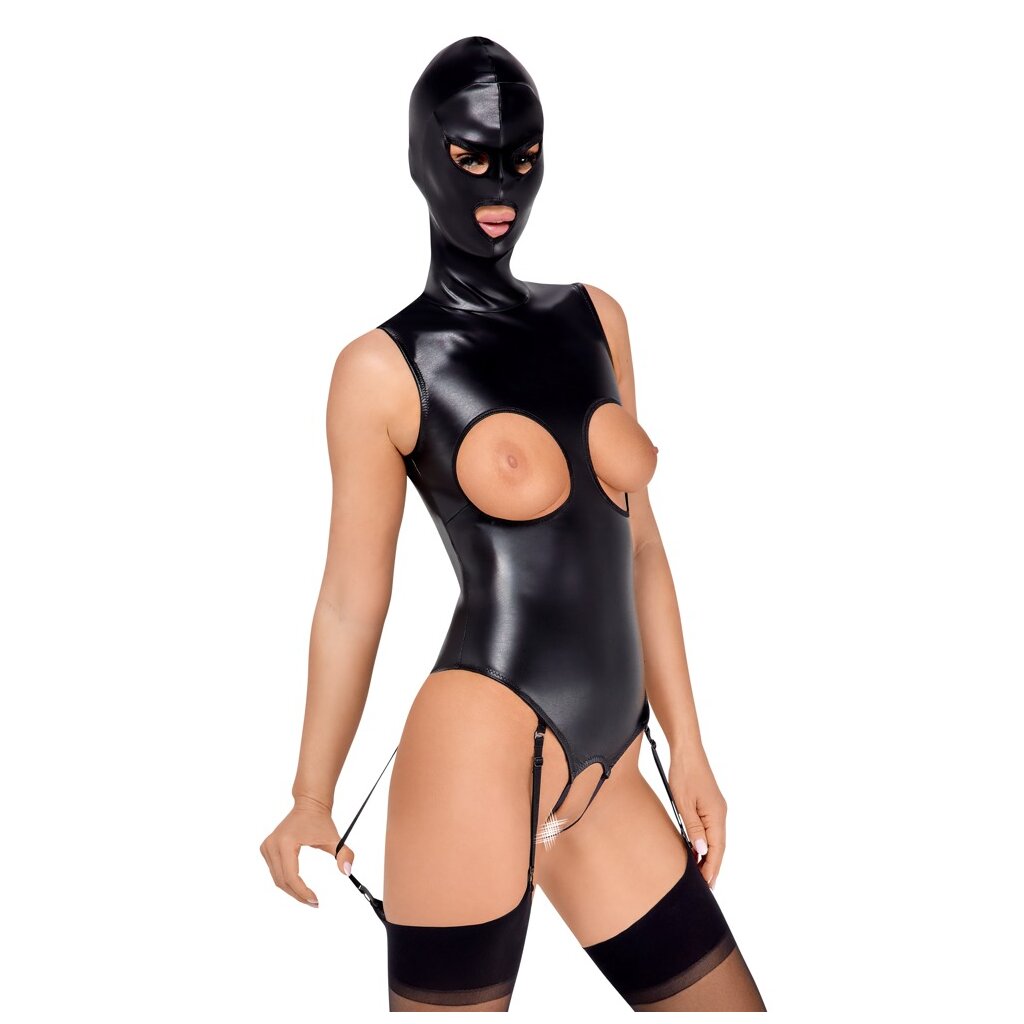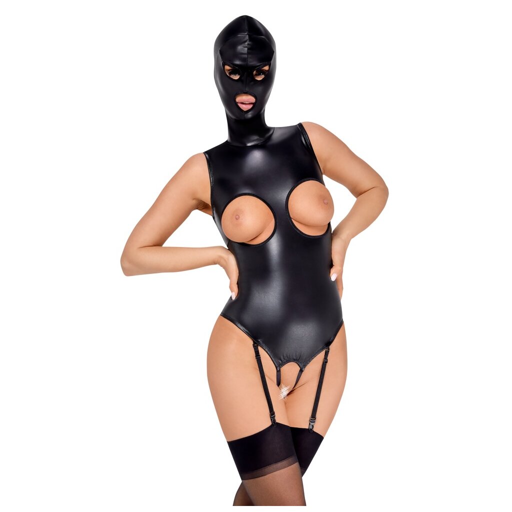 Ausgefallener schwarzer Strapsbody von Bad Kitty mit angesetzter Kopfmaske. Aus stilvollem Kunstleder - weich und dehnbar für einen hohen Tragekomfort. Mit sorgfältig eingearbeitetem Reißverschluss auf der Rückseite. Aufregend busenfrei und im Schritt einladend offen. Kopfmaske mit Öffnungen für Augen und Mund. Die verstellbaren Strapshalter sind abnehmbar.
