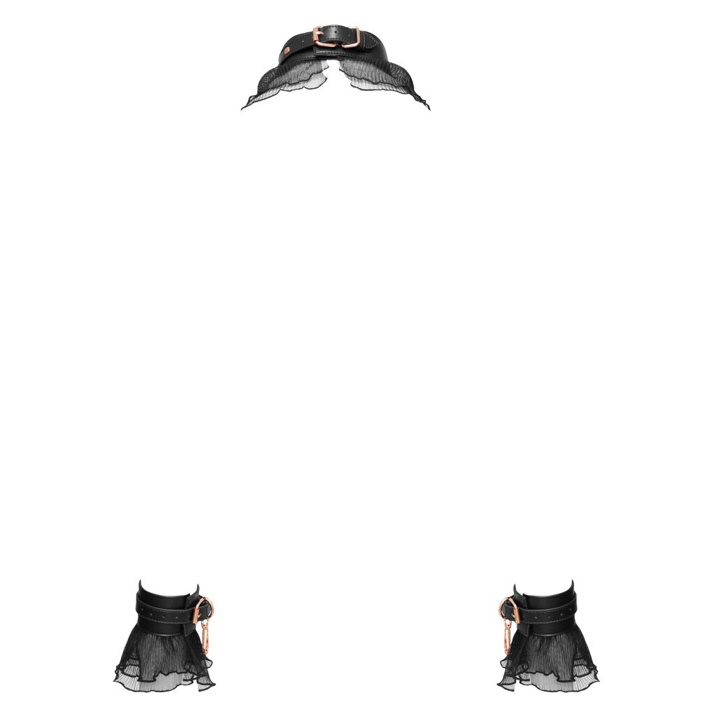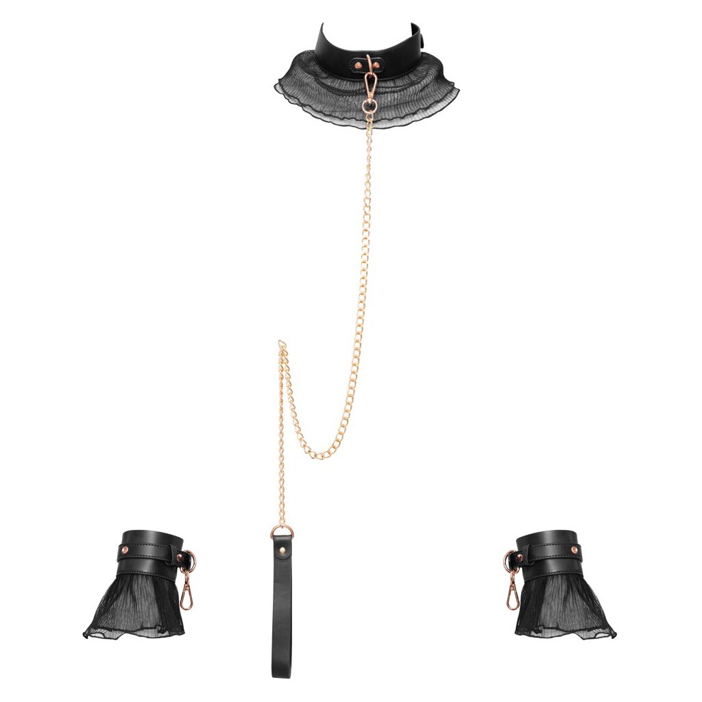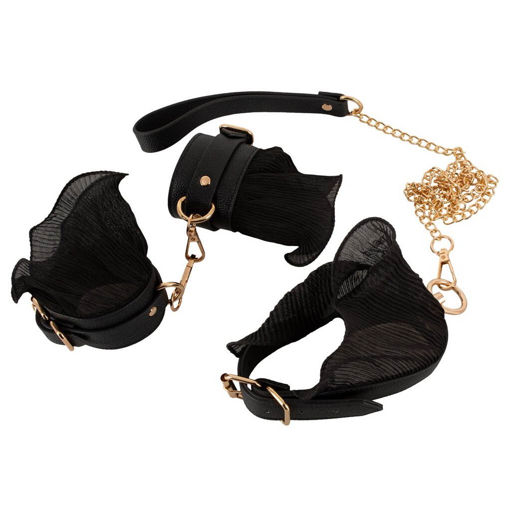Ensemble de bondage de haute qualité de Bad Kitty comprenant un collier avec laisse et des menottes. En cuir élégant avec de délicats volants plissés et des détails en métal doré. Tous les poignets confortables sont réglables en circonférence pour s'adapter. Les menottes sont munies d'un anneau et d'un mousqueton, le collier est muni d'un anneau et d'une laisse détachable avec mousqueton et boucle pour la main.