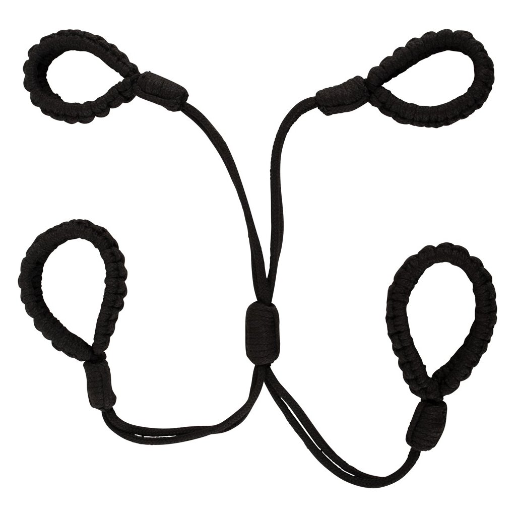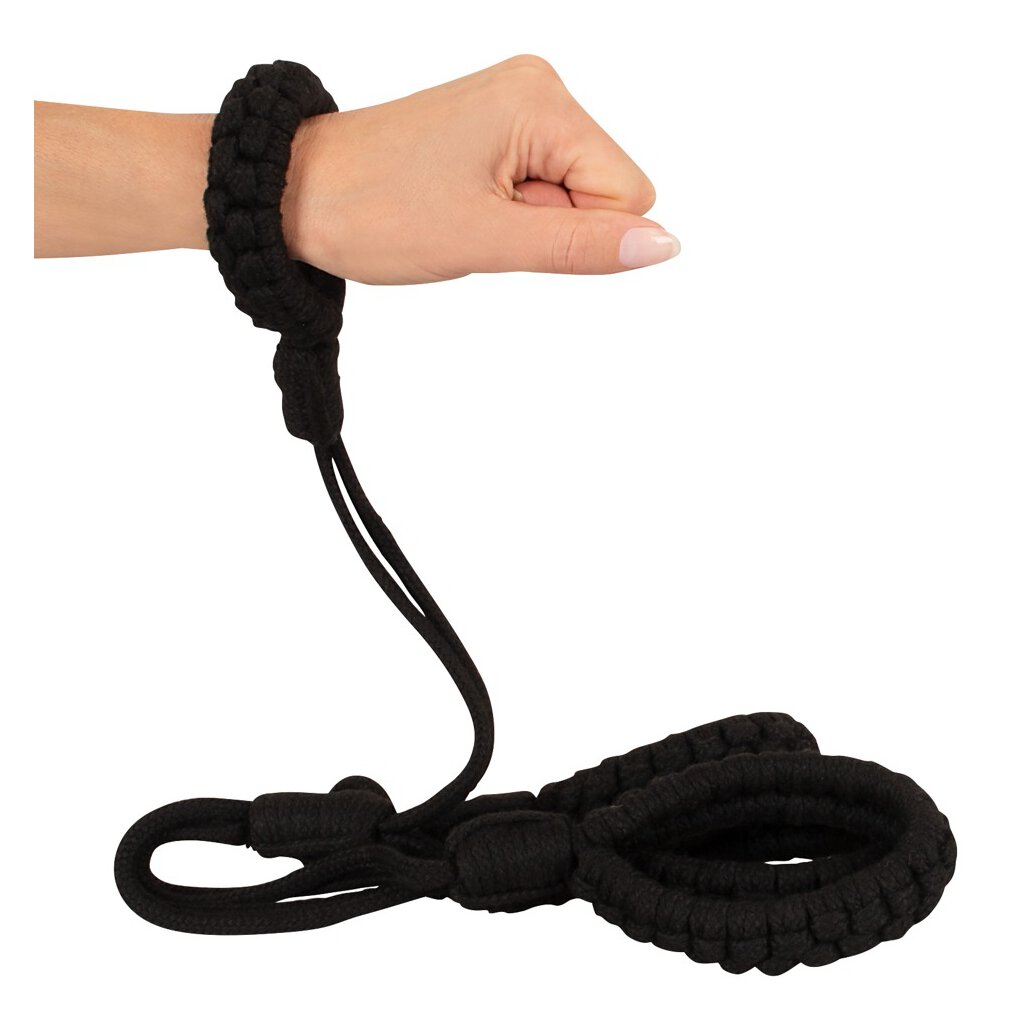 Le Cuff Set Rope de Bad Kitty se compose d'une croix de contention avec des boucles pour les mains et les pieds. L'entrave est faite de cordes de coton torsadées douces et, grâce à ses nœuds réglables en continu, elle s'enfile rapidement et s'adapte confortablement à la circonférence appropriée des poignets et des chevilles - parfait pour les débutants en bondage !