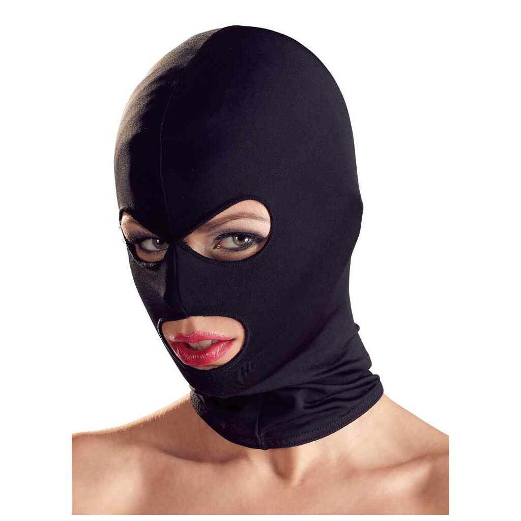 Schwarze, eng anliegende Kopfmaske aus elastischem Stoff. Augen und Mund sind frei. 92% Polyester, 8% Elasthan.