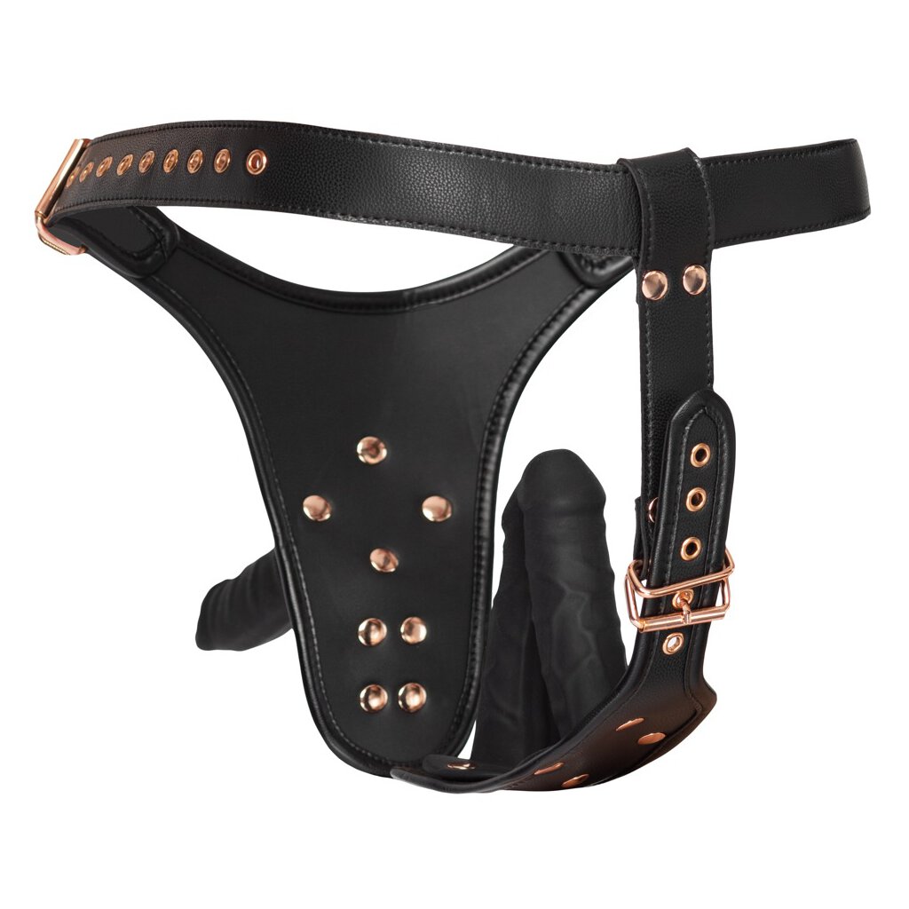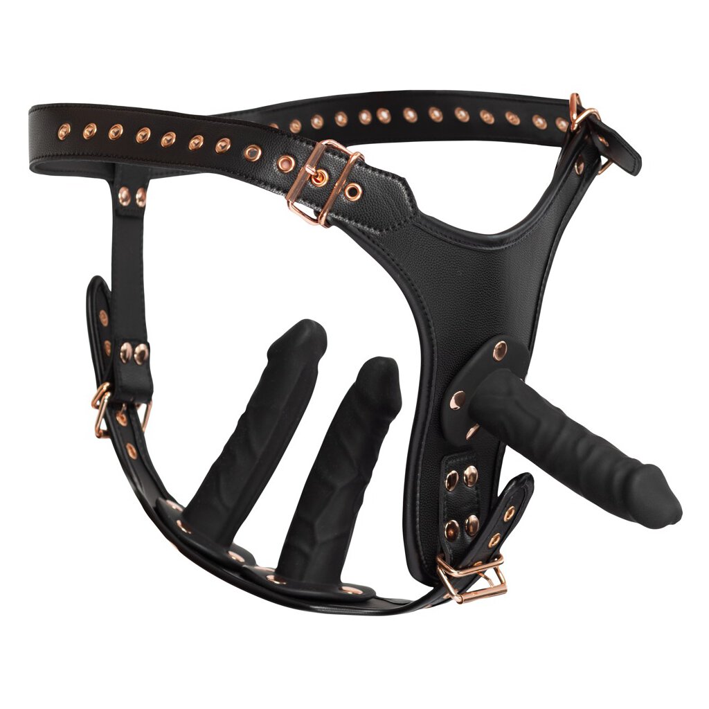String-on de Bad Kitty avec 3 godes naturels de tailles différentes, qui sont fermement insérés dans le string et dans l'entrejambe. String à l'aspect cuir élégant avec des bords soignés et des détails métalliques de couleur or rose. Réglable dans chaque cas sur le côté et dans l'entrejambe avec des fermetures à boucle pour un ajustement ferme et confortable. Chaque gode a l'aspect d'un pénis avec un gland prononcé et des veines.