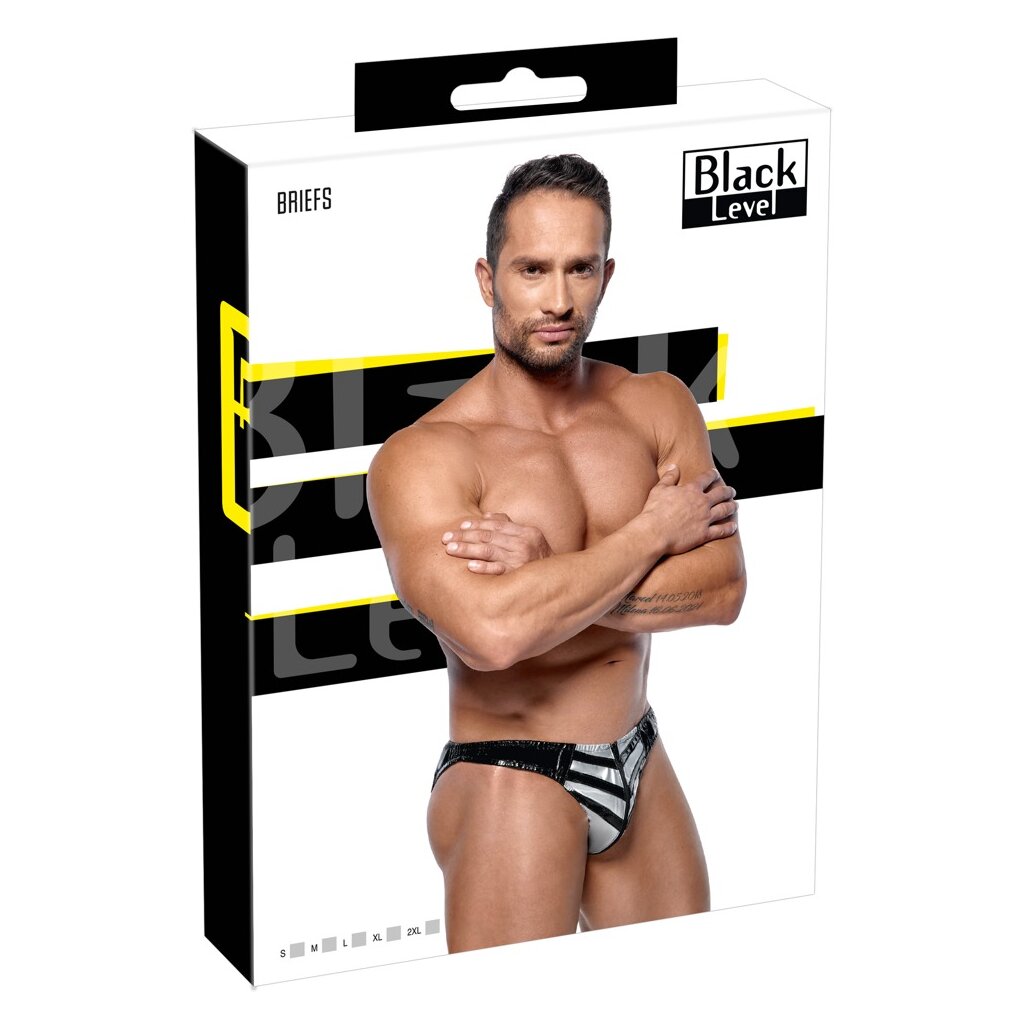 Lackslip von Black Level in glänzendem Schwarz. Silberfarbener Pouch in rassiger Streifenoptik mit Reißverschluss. Elastischer Bund und Beinabschlüsse für einen perfekten und bequemen Sitz.