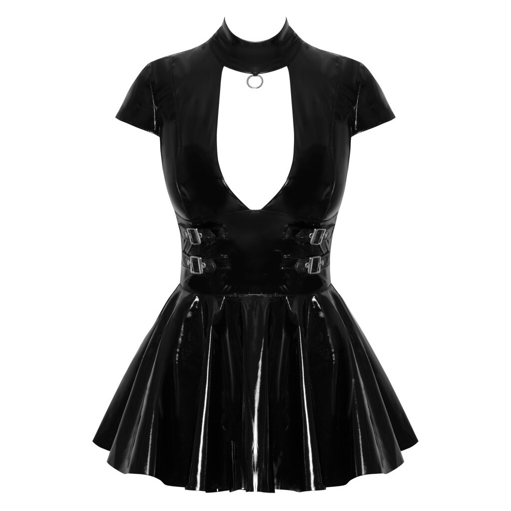 Minikleid von Black Level aus glänzendem schwarzem Lackleder. Figurbetonter, taillierter Schnitt mit ausgestelltem Rock. Mit kurzen Ärmeln und strengem Stehkragen mit einem (Manschetten-)Ring vorne. Großer Ausschnitt am Dekolleté. Zwei verstellbare Schnallenriemen an den Seiten der Taille. Durchgehender Reißverschluss hinten.