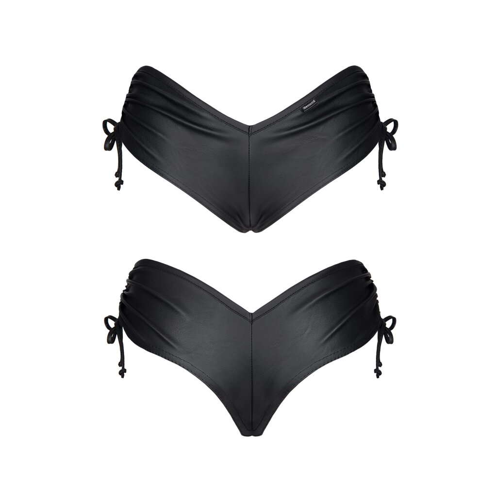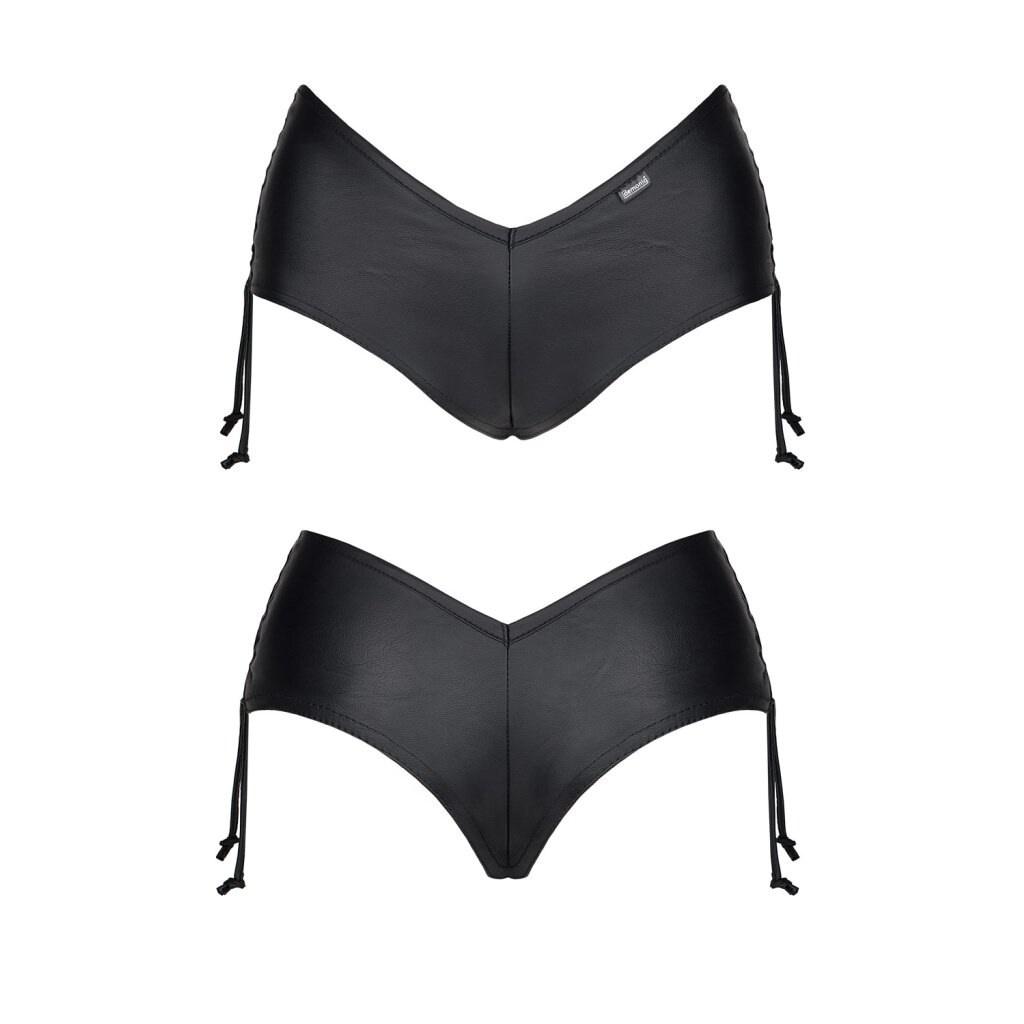 Freche und sinnliche Shorts aus schwarzem, elastischem Ökoleder. Vorne und hinten sind sie mit einer Dreiecksform an der Taille und vertikalen Kordelzügen an den Seiten akzentuiert. Die Rückseite bezaubert mit dem Blick auf verführerische Pobacken, die durch einen speziell geformten Schnitt betont werden. Das Material ist angenehm auf der Haut und passt sich dem Körper perfekt an. Dank der Kordelzüge an beiden Seiten lässt sich das Aussehen der Shorts auf verschiedene Weise verändern. Mit zurückgezogenen Kordeln sind sie definitiv die sexy Variante. Sie sind freizügiger und betonen die Kurven des Gesäßes und die Form der Hüften. Werden die Bänder gelöst, haben sie den Charakter einer klassischen Shorts. Sie passen unter anderem perfekt zu dem Top BRAdriana001 - auf dem Bild zu sehen. 95 % Polyester / 5% Elastan Farbe: schwarz