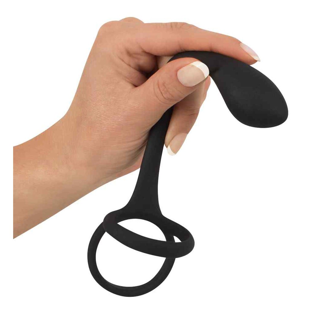 3-in-1: Der Analplug mit dem gewissen Extra! Holen Sie sich die dreifache Stimulation, denn mit diesem schwarzen Analplug von „Black Velvets“ erfreuen Sie nicht nur Ihr Hinterstübchen, stattdessen geht es auch vorn ordentlich zur Sache! Die integrierten Ringe werden über Penis und Hoden gezogen und sorgen für einen Blutstau-Effekt, durch den Ihre Erektion noch härter, kräftiger und vor allem langanhaltender werden kann. Der Analplug selbst besitzt einen verdickten Kopf zur gezielten Stimulation der Prostata, dem P-Punkt genannten Lustpunkt des Mannes. Der schmale Schaft des Analplugs geht fließend in den Verbindungssteg zu Penisring und Hodenring über und dient gleichzeitig auch zur Stimulation des Perineums.