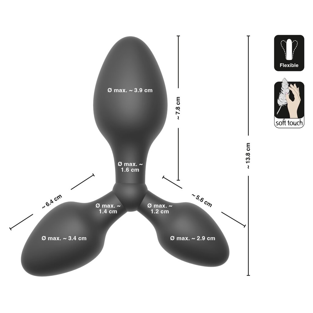 The Training triple butt plug from Black Velvets combines 3 anal plugs of different sizes in one. The handy, flexible toy is perfect for rectal stimulation and anal stretching training. Made entirely of silicone with a silky surface for easy insertion, optimal adjustment and complete comfort. Each anal-safe plug (S-L) is conically shaped with a sensitive tip. Also flexible in the taper for easy handling and a good hold.