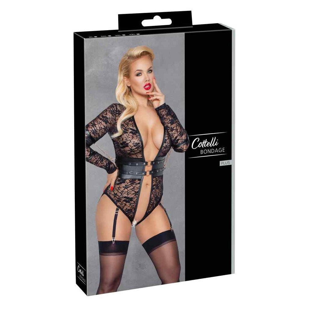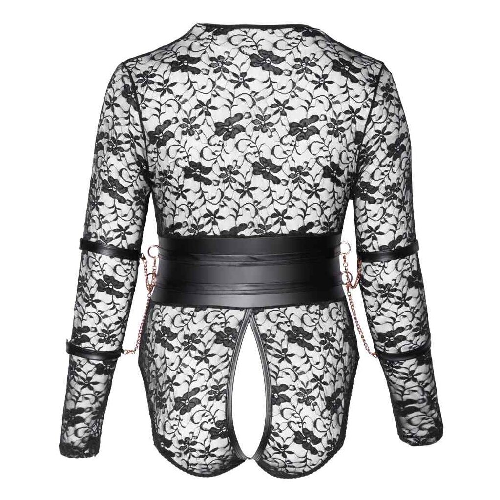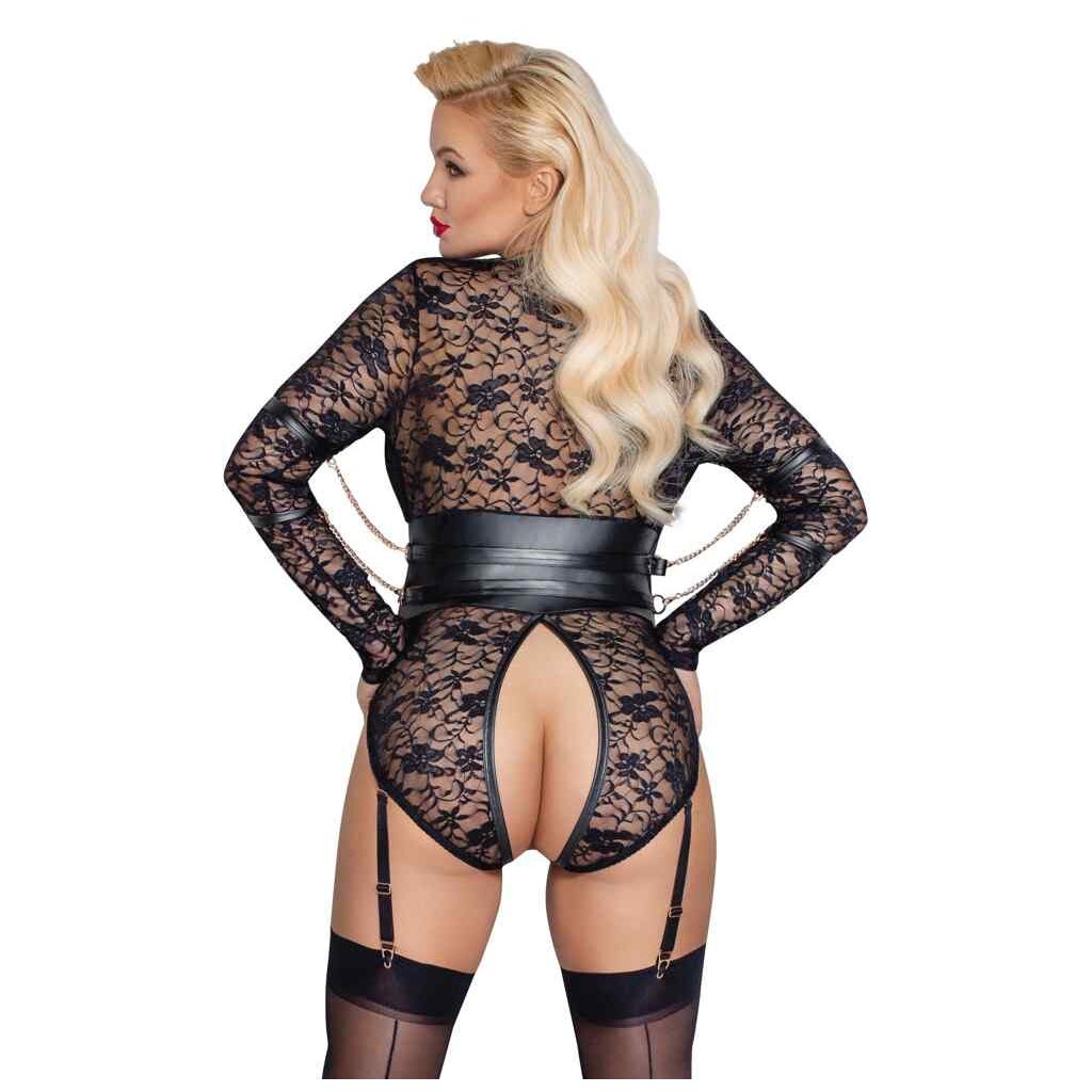 Long-sleeved body by Cottelli BONDAGE made of soft elastic lace with matt look insert around the waist and rose gold-colored elements. For captivating moments of pleasure, the four arm cuffs can be attached to the side rings of the waist insert with their carabiner chains. The bodysuit is completely open in the front, through the crotch and up over the buttocks and is only held together by two rings in the front. The adjustable suspenders are removable from the panty part.
