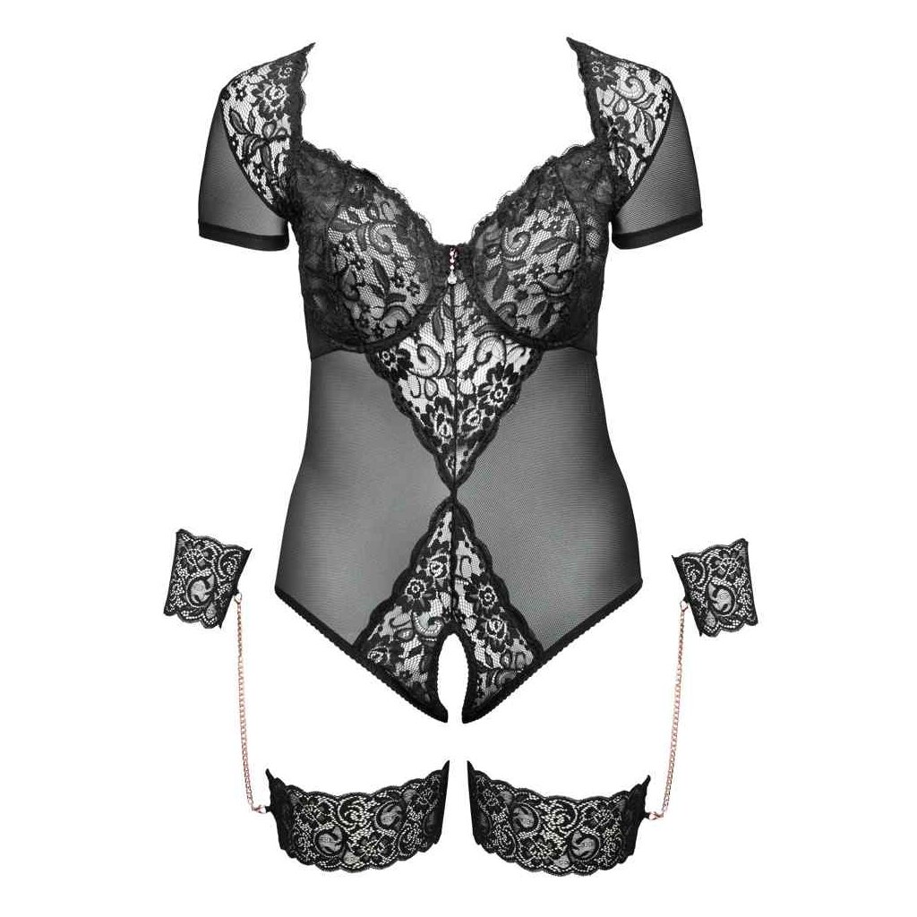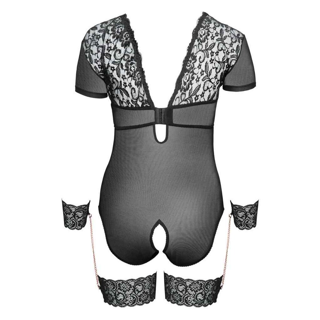 Body ouvert by Cottelli BONDAGE made of elastic powernet with fine lace inserts. With half arm and rhinestone decoration between the underwire cups. In the back with hook closure. Panty part open in the crotch, front with lace, back completely made of powernet. Included are thigh and hand cuffs made of lace, connected by rose gold-colored, detachable carabiner chains.