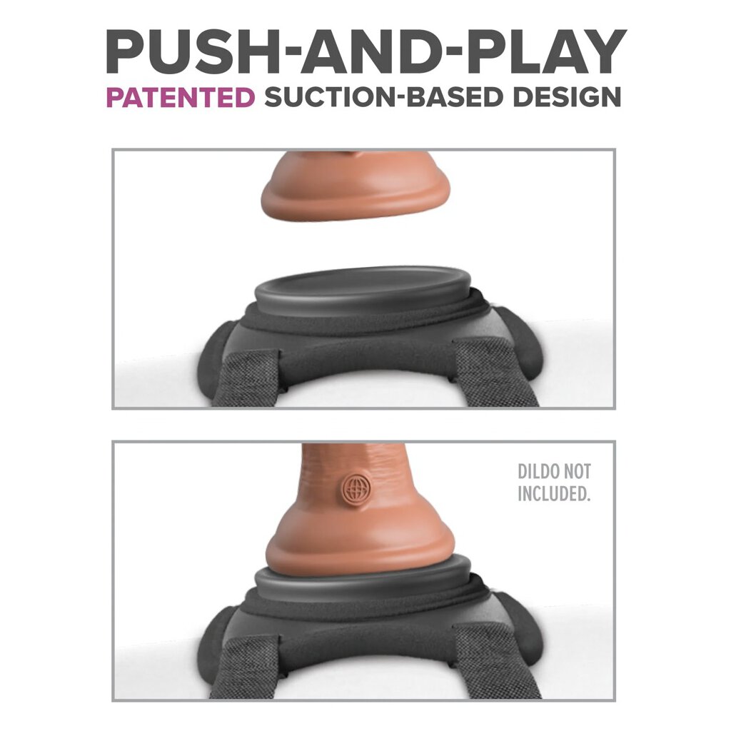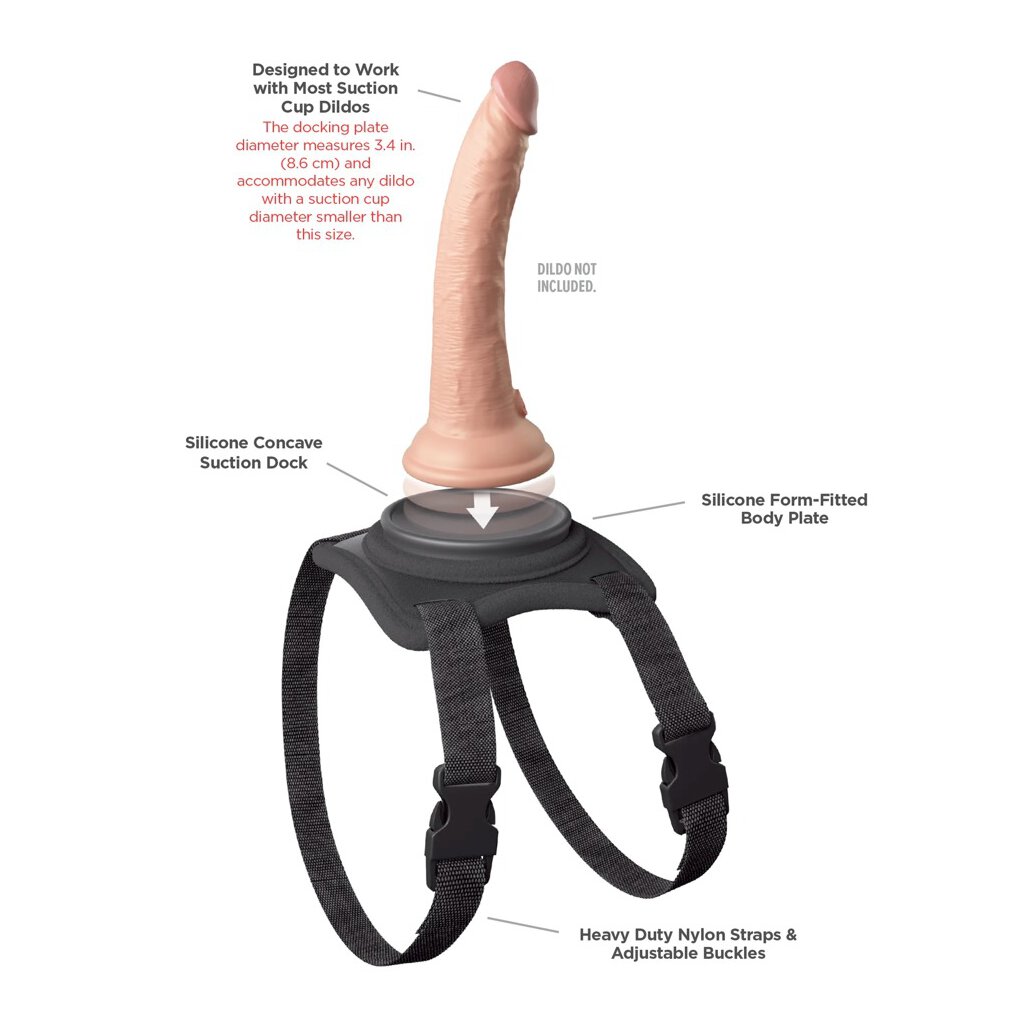 The simple comfortable strap-on system is based on the anatomically curved docking plate, in which any suction base of a dildo or vibrator (not included) can be fixed/docked. The dildo / vibrator is held in an optimal shock-friendly position (Push & Play). The soft padded docking plate made of silicone distributes the pressure evenly over the leg area, so that punctual uncomfortable pressure is avoided. Everything adapts perfectly to the anatomy and movements. The sturdy wide straps are adjustable in fit with plastic sliders for a firm and comfortable fit.