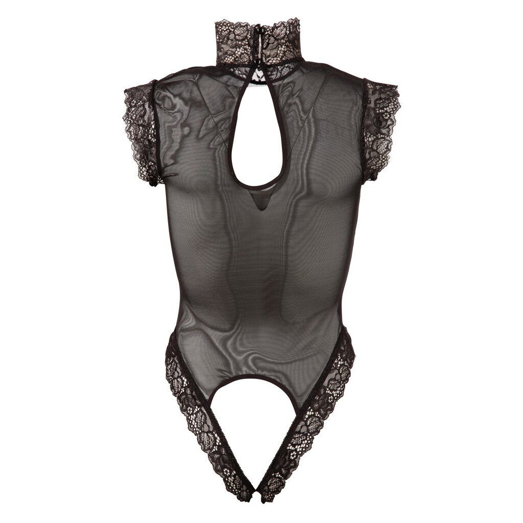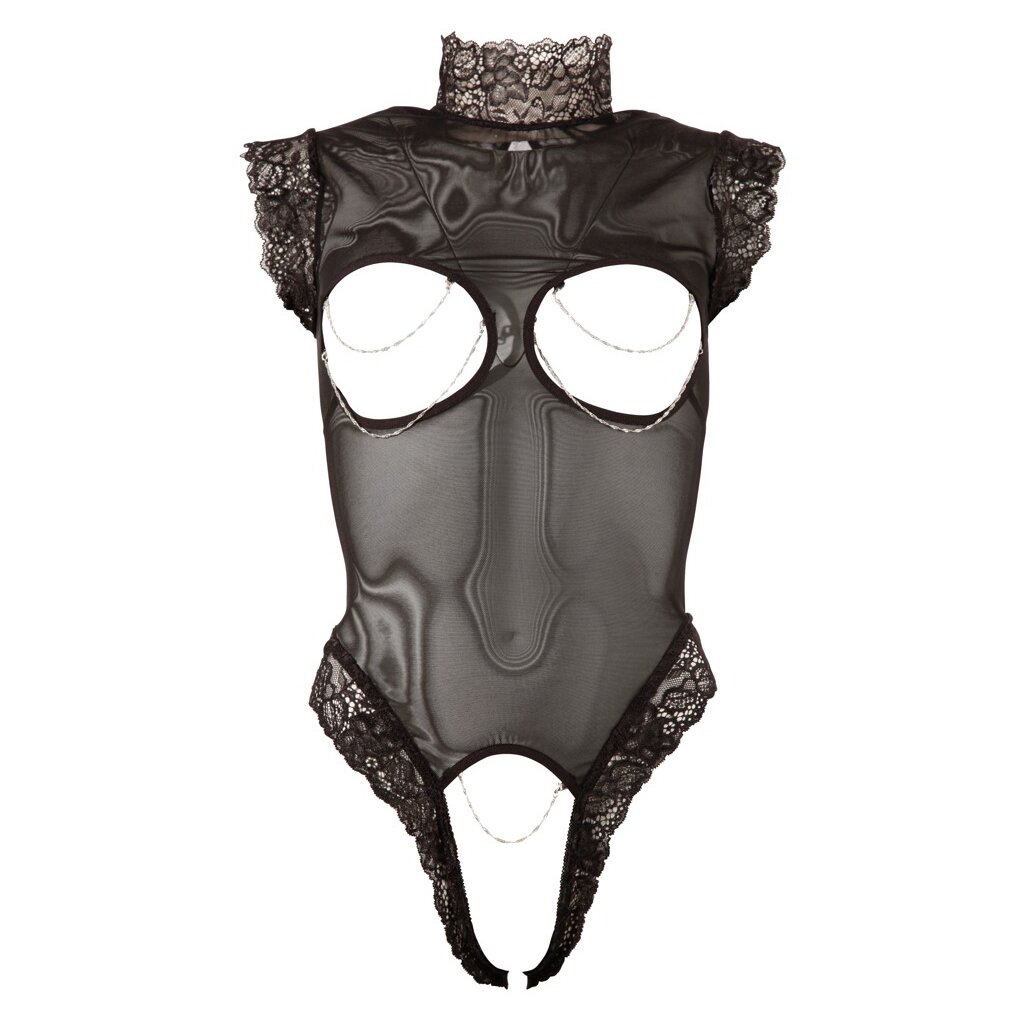 Mehr als anziehend! Schwarz transparenter Body mit Spitzenbesatz an den Armen, dem Halsband (2 Knöpfe hinten) und den Beinausschnitten. Busen und Scham sind offen und mit abnehmbaren Kettchen verziert. 90% Polyamid, 10% Elasthan.