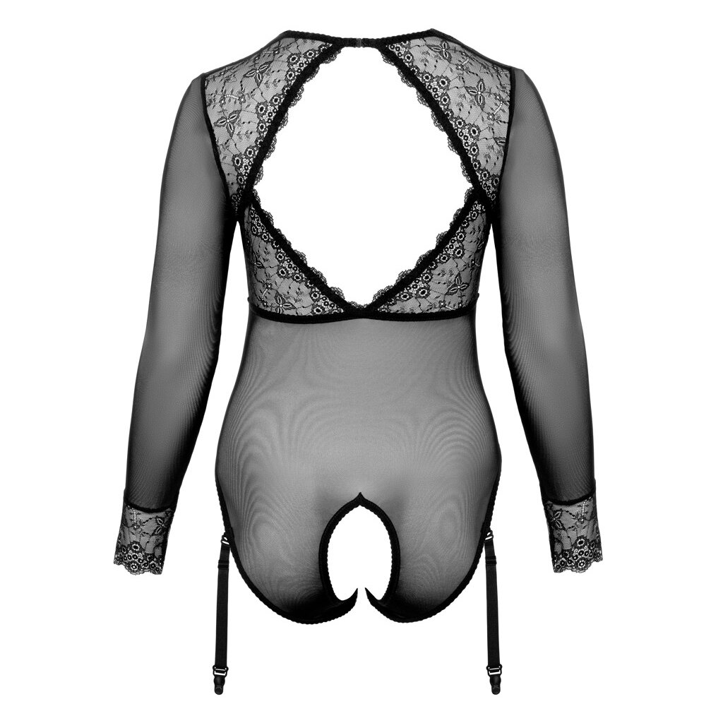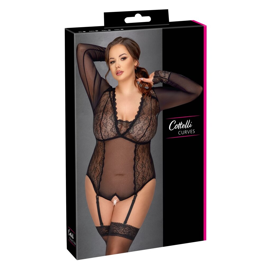 Body ouvert à manches longues noir-transparent de Cottelli CURVES en powernet fin avec empiècements de dentelle délicate. Élastique sur tout le pourtour, il est doux et moelleux pour une coupe moulante et un grand confort de port. Grand décolleté dans le dos, fermeture à clip dans le cou. Ouverture invitante à l'entrejambe jusqu'aux fesses. Les deux bretelles à l'avant sont réglables et entièrement amovibles.