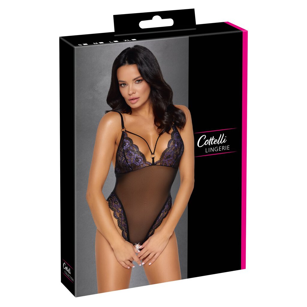 Beautiful bodysuit by Cottelli LINGERIE made of fine powernet with 2-tone flower lace on the soft cups and the high leg cutouts. All around soft and elastic for high wearing comfort. In the décolleté decorative stretch straps connected with a ring. The straps are adjustable to fit. Two elastic straps lead through the open crotch.