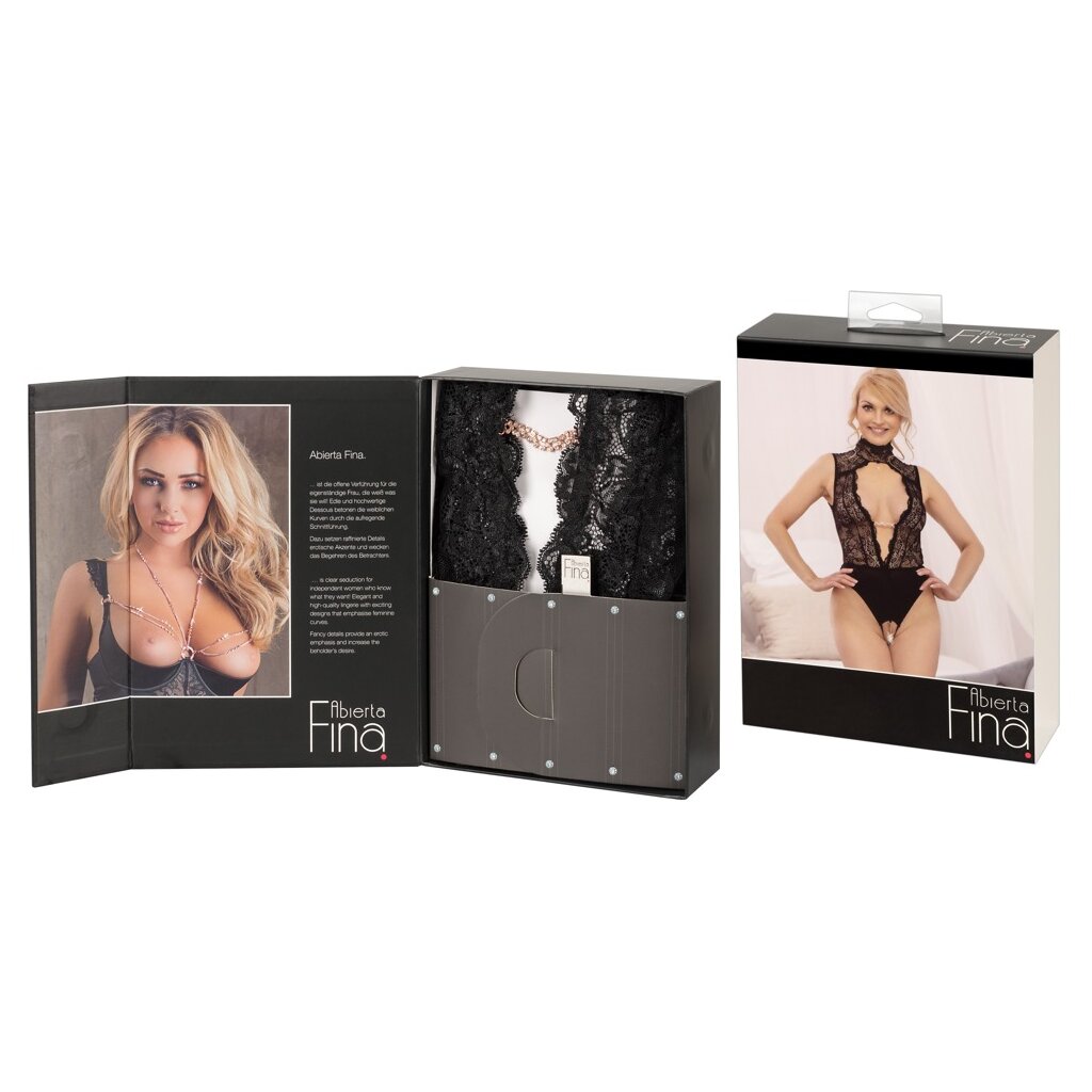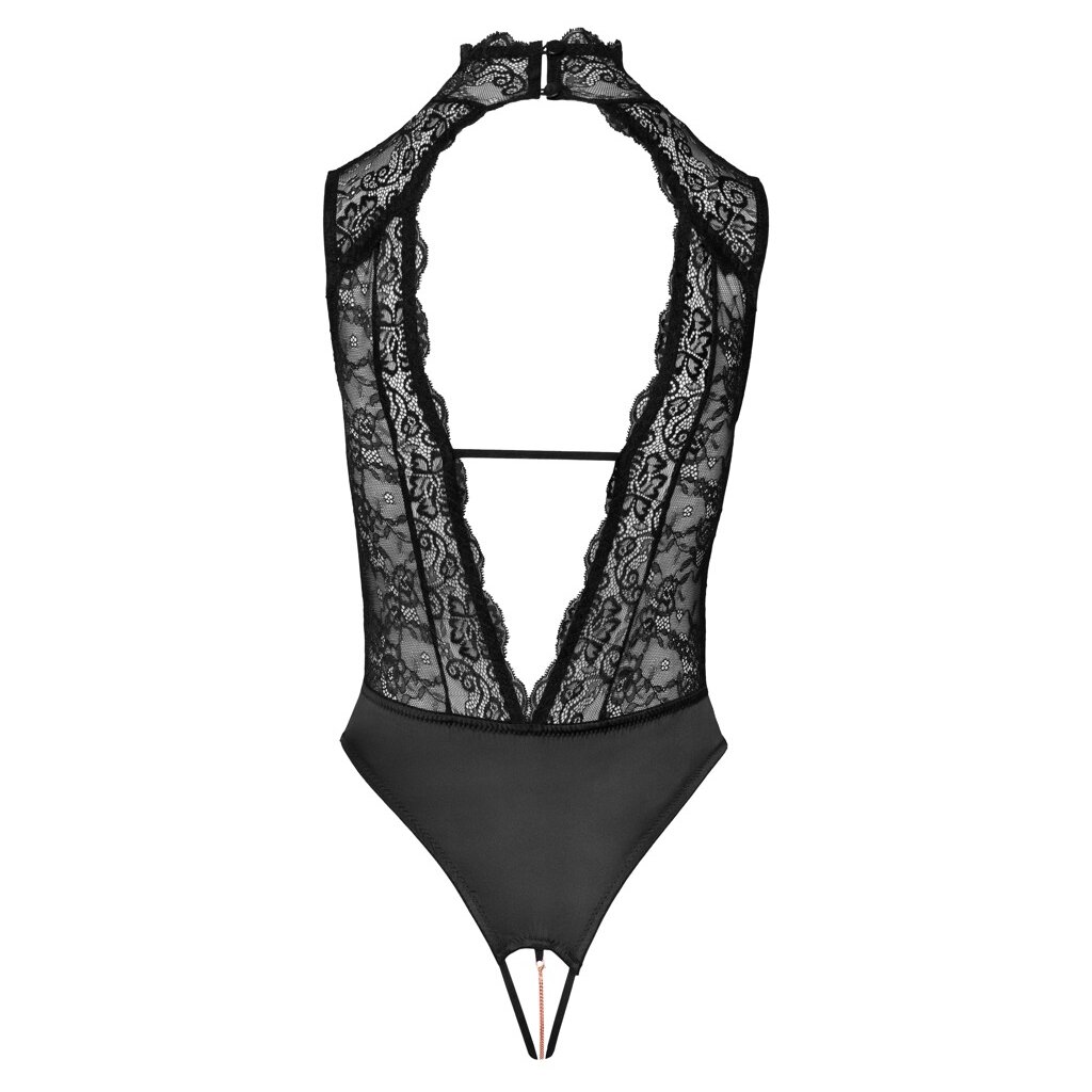 Sensational bodysuit by Abierta Fina in two-piece optics made of fine soft lace and noble stretch satin. Despite high well-behaved stand-up collar for buttoning incredibly provocative by the large cutout in front and in the back. A small rhinestone pendant on the collar and a shimmering rhinestone chain in the front also act as eye-catchers. Also very tempting is the completely open crotch, through which a stimulating chain leads, which can also be removed.
