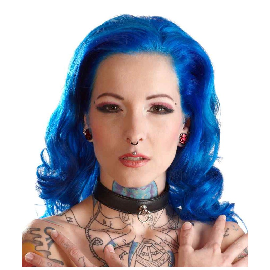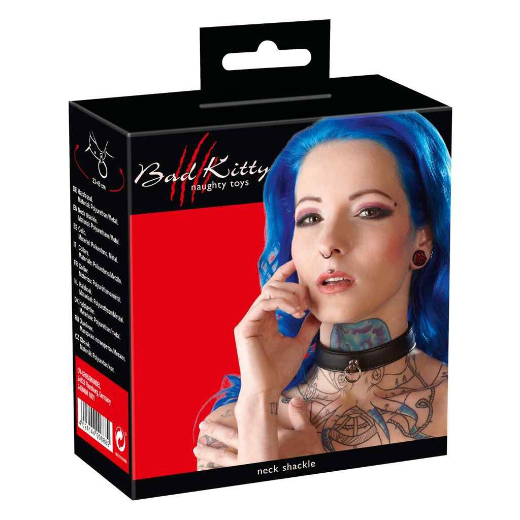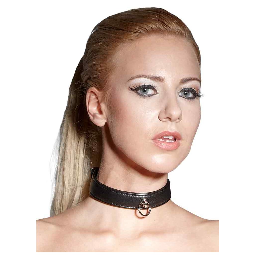 Collier de bondage en simili cuir noir. Avec un petit anneau au centre. Matériau à double couche avec des bords cousus. Taille : 49 x 2,5 cm. Polyuréthane, métal.