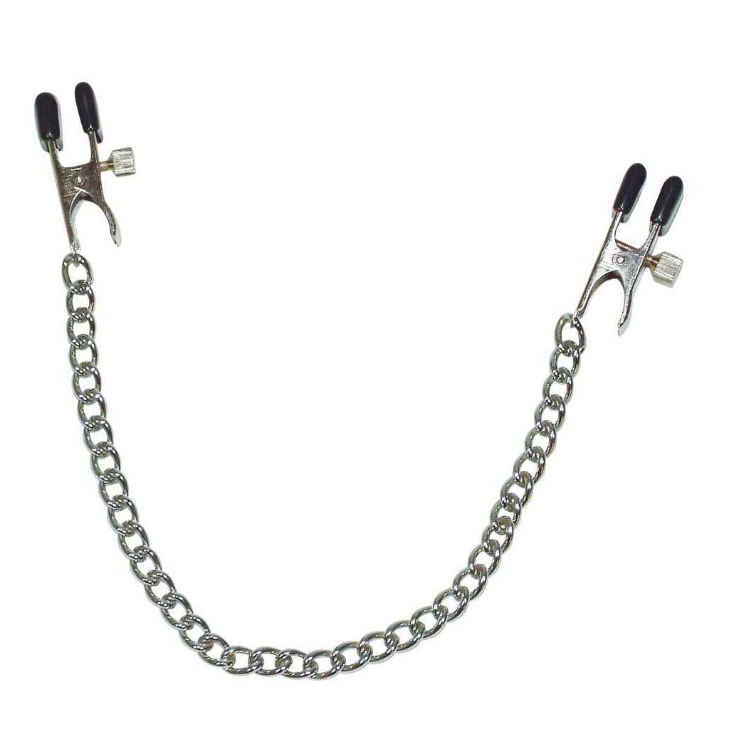 Pour ELLE et LUI ! Deux pinces à tétons attachées à une chaîne métallique de 30 cm de long. Pinces : 1,5 cm de large, 5,5 cm de long, l'intensité de la pression peut être réglée individuellement avec les pinces à vis. Poids total : environ 70 g.