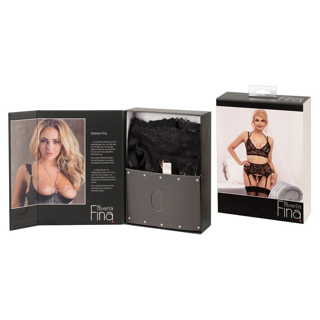 Bralette, suspender belt and slip ouvert united in the set by Abierta Fina. Everything is made of fine elastic lace and adorned with rose gold-colored elements, as well as chains decorated with rhinestones. The bralette with its slit cups allows sensual access. The completely crotchless panties seduce with a stimulating little chain. And the airy suspender belt in lace-up look rounds off the revealing ensemble in an elegantly erotic way. The straps, halter neck and garter belt are adjustable for an optimal fit. The chains are all removable.