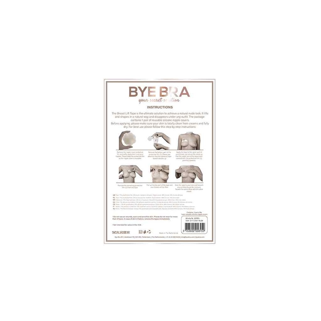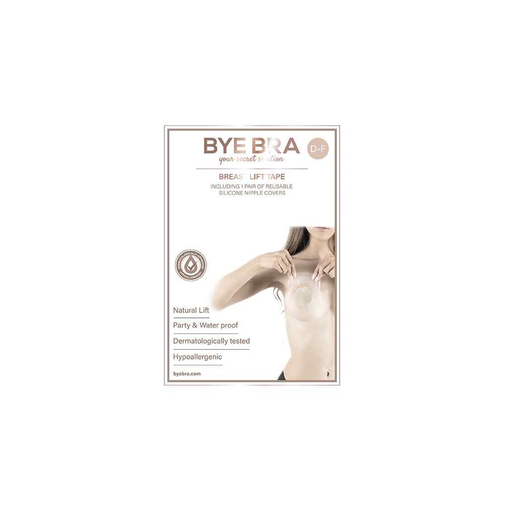 La bande adhésive de soutien-gorge Bye Bra maintient les seins en place, tout en permettant à la porteuse de bouger librement et en contenant tout mouvement naturel excessif des seins. La bande adhésive pour soutien-gorge est disponible en trois tailles : bonnets A-C, D-F et F . La variante D-F contient trois paires de remontées mammaires et trois paires de cache-mamelons.